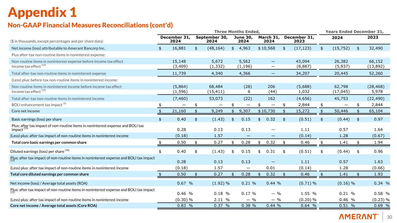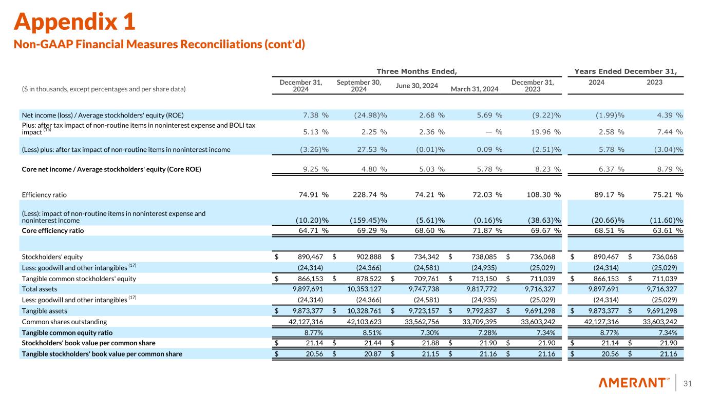 30 Three Months Ended, Years Ended December 31, ($ in thousands, except percentages and per share data) December 31, 2024 September 30, 2024 June 30, 2024 March 31, 2024 December 31, 2023 2024 2023 Net income (loss) attributable to Amerant Bancorp Inc. $ 16,881 $ (48,164) $ 4,963 $ 10,568 $ (17,123) $ (15,752) $ 32,490 Plus after-tax non-routine items in noninterest expense: Non-routine items in noninterest expense before income tax effect 15,148 5,672 5,562 — 43,094 26,382 66,152 Income tax effect (14) (3,409) (1,332) (1,196) — (8,887) (5,937) (13,892) Total after-tax non-routine items in noninterest expense 11,739 4,340 4,366 — 34,207 20,445 52,260 (Less) plus: before-tax non-routine items in noninterest income: Non-routine items in noninterest income before income tax effect (5,864) 68,484 (28) 206 (5,688) 62,798 (28,468) Income tax effect (14) (1,596) (15,411) 6 (44) 1,032 (17,045) 5,978 Total after-tax non-routine items in noninterest income (7,460) 53,073 (22) 162 (4,656) 45,753 (22,490) BOLI enhancement tax impact (3) $ — $ — $ — $ — $ 2,844 $ — $ 2,844 Core net income $ 21,160 $ 9,249 $ 9,307 $ 10,730 $ 15,272 $ 50,446 $ 65,104 Basic earnings (loss) per share $ 0.40 $ (1.43) $ 0.15 $ 0.32 $ (0.51) $ (0.44) $ 0.97 Plus: after tax impact of non-routine items in noninterest expense and BOLI tax impact (15) 0.28 0.13 0.13 — 1.11 0.57 1.64 (Less) plus: after tax impact of non-routine items in noninterest income (0.18) 1.57 — — (0.14) 1.28 (0.67) Total core basic earnings per common share $ 0.50 $ 0.27 $ 0.28 $ 0.32 $ 0.46 $ 1.41 $ 1.94 Diluted earnings (loss) per share (16) $ 0.40 $ (1.43) $ 0.15 $ 0.31 $ (0.51) $ (0.44) $ 0.96 Plus: after tax impact of non-routine items in noninterest expense and BOLI tax impact (15) 0.28 0.13 0.13 — 1.11 0.57 1.63 (Less) plus: after tax impact of non-routine items in noninterest income (0.18) 1.57 — 0.01 (0.14) 1.28 (0.66) Total core diluted earnings per common share $ 0.50 $ 0.27 $ 0.28 $ 0.32 $ 0.46 $ 1.41 $ 1.93 Net income (loss) / Average total assets (ROA) 0.67 % (1.92) % 0.21 % 0.44 % (0.71) % (0.16) % 0.34 % Plus: after tax impact of non-routine items in noninterest expense and BOLI tax impact (15) 0.46 % 0.18 % 0.17 % — % 1.55 % 0.21 % 0.58 % (Less) plus: after tax impact of non-routine items in noninterest income (0.30) % 2.11 % — % — % (0.20) % 0.46 % (0.23) % Core net income / Average total assets (Core ROA) 0.83 % 0.37 % 0.38 % 0.44 % 0.64 % 0.51 % 0.69 % Appendix 1 Non-GAAP Financial Measures Reconciliations (cont'd)