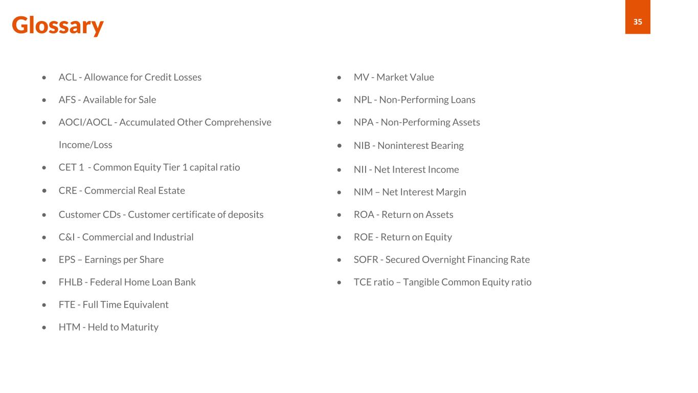 35 • ACL - Allowance for Credit Losses • AFS - Available for Sale • AOCI/AOCL - Accumulated Other Comprehensive Income/Loss • CET 1 - Common Equity Tier 1 capital ratio • CRE - Commercial Real Estate • Customer CDs - Customer certificate of deposits • C&I - Commercial and Industrial • EPS – Earnings per Share • FHLB - Federal Home Loan Bank • FTE - Full Time Equivalent • HTM - Held to Maturity • MV - Market Value • NPL - Non-Performing Loans • NPA - Non-Performing Assets • NIB - Noninterest Bearing • NII - Net Interest Income • NIM – Net Interest Margin • ROA - Return on Assets • ROE - Return on Equity • SOFR - Secured Overnight Financing Rate • TCE ratio – Tangible Common Equity ratio Glossary