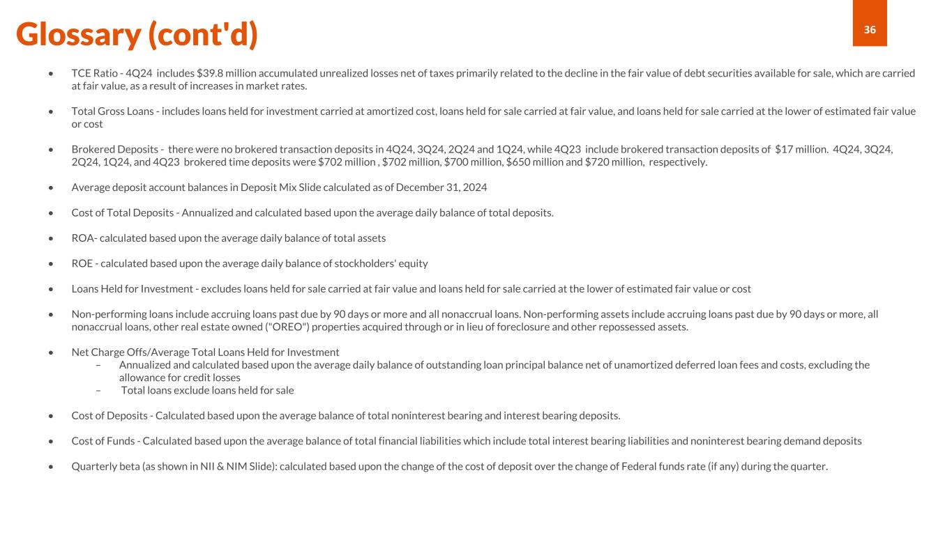 36Glossary (cont'd) • TCE Ratio - 4Q24 includes $39.8 million accumulated unrealized losses net of taxes primarily related to the decline in the fair value of debt securities available for sale, which are carried at fair value, as a result of increases in market rates. • Total Gross Loans - includes loans held for investment carried at amortized cost, loans held for sale carried at fair value, and loans held for sale carried at the lower of estimated fair value or cost • Brokered Deposits - there were no brokered transaction deposits in 4Q24, 3Q24, 2Q24 and 1Q24, while 4Q23 include brokered transaction deposits of $17 million. 4Q24, 3Q24, 2Q24, 1Q24, and 4Q23 brokered time deposits were $702 million , $702 million, $700 million, $650 million and $720 million, respectively. • Average deposit account balances in Deposit Mix Slide calculated as of December 31, 2024 • Cost of Total Deposits - Annualized and calculated based upon the average daily balance of total deposits. • ROA- calculated based upon the average daily balance of total assets • ROE - calculated based upon the average daily balance of stockholders' equity • Loans Held for Investment - excludes loans held for sale carried at fair value and loans held for sale carried at the lower of estimated fair value or cost • Non-performing loans include accruing loans past due by 90 days or more and all nonaccrual loans. Non-performing assets include accruing loans past due by 90 days or more, all nonaccrual loans, other real estate owned ("OREO") properties acquired through or in lieu of foreclosure and other repossessed assets. • Net Charge Offs/Average Total Loans Held for Investment – Annualized and calculated based upon the average daily balance of outstanding loan principal balance net of unamortized deferred loan fees and costs, excluding the allowance for credit losses – Total loans exclude loans held for sale • Cost of Deposits - Calculated based upon the average balance of total noninterest bearing and interest bearing deposits. • Cost of Funds - Calculated based upon the average balance of total financial liabilities which include total interest bearing liabilities and noninterest bearing demand deposits • Quarterly beta (as shown in NII & NIM Slide): calculated based upon the change of the cost of deposit over the change of Federal funds rate (if any) during the quarter.