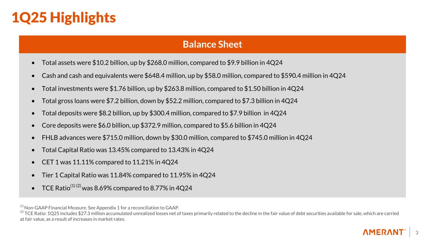 2 Important Notices and Disclaimers Forward-Looking Statements This presentation contains “forward-looking statements” including statements with respect to the Company’s objectives, expectations and intentions and other statements that are not historical facts. Examples of forward- looking statements include but are not limited to: our future operating or financial performance, including revenues, expenses, expense savings, income or loss and earnings or loss per share, and other financial items; statements regarding expectations, plans or objectives for future operations, products or services, and our expectations on our investment portfolio repositioning and loan recoveries or reaching positive resolutions on problem loans. All statements other than statements of historical fact are statements that could be forward-looking statements. You can identify these forward-looking statements through our use of words such as “may,” “will,” “anticipate,” “assume,” “should,” “indicate,” “would,” “believe,” “contemplate,” “expect,” “estimate,” “continue,” “plan,” “point to,” “project,” “could,” “intend,” “target,” “goals,” “outlooks,” “modeled,” “dedicated,” “create,” and other similar words and expressions of the future. Forward-looking statements, including those relating to our beliefs, plans, objectives, goals, expectations, anticipations, estimates and intentions, involve known and unknown risks, uncertainties and other factors, which may be beyond our control, and which may cause the Company’s actual results, performance, achievements, or financial condition to be materially different from future results, performance, achievements, or financial condition expressed or implied by such forward-looking statements. You should not rely on any forward-looking statements as predictions of future events. You should not expect us to update any forward-looking statements, except as required by law. All written or oral forward-looking statements attributable to us are expressly qualified in their entirety by this cautionary notice, together with those risks and uncertainties described in “Risk factors” in our annual report on Form 10-K for the fiscal year ended December 31, 2024 filed on March 5, 2025, and in our other filings with the U.S. Securities and Exchange Commission (the “SEC”), which are available at the SEC’s website www.sec.gov. Interim Financial Information Unaudited financial information as of and for interim periods, including the three -month periods ended March 31, 2025, December 31, 2024, and March 31, 2024, may not reflect our results of operations for our fiscal year ending, or financial condition as of December 31, 2025, or any other period of time or date. Non-GAAP Financial Measures The Company supplements its financial results that are determined in accordance with accounting principles generally accepted in the United States of America (“GAAP”) with non-GAAP financial measures, such as “pre- provision net revenue (PPNR)”, “core pre-provision net revenue (Core PPNR)”, “core noninterest income”, “core noninterest expense”, “core net income”, “core earnings per share (basic and diluted)”, “core return on assets (Core ROA)”, “core return on equity (Core ROE)”, “core efficiency ratio”, “tangible stockholders’ equity (book value) per common share”, “tangible common equity ratio, adjusted for net unrealized accumulated losses on debt securities held to maturity”, and “tangible stockholders' equity (book value) per common share, adjusted for net unrealized accumulated losses on debt securities held to maturity”. This supplemental information is not required by, or is not presented in accordance with GAAP. The Company refers to these financial measures and ratios as “non-GAAP financial measures”. We use certain non-GAAP financial measures, including those mentioned above, both to explain our results to shareholders and the investment community and in the internal evaluation and management of our business. Management believes that these supplementary non-GAAP financial measures and the information they provide are useful to investors since these measures permit investors to view our performance using the same tools that our management uses to evaluate our past performance and prospects for future performance. While we believe that these non-GAAP financial measures are useful in evaluating our performance, this information should be considered as supplemental and not as a substitute for or superior to the related financial information prepared in accordance with GAAP. Additionally, these non-GAAP financial measures may differ from similar measures presented by other companies. Appendix 1 reconciles these non-GAAP financial measures to reported results.
