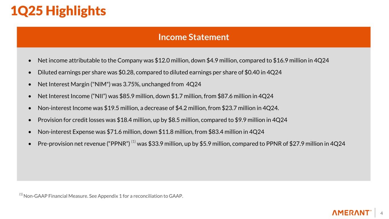 3 1Q25 Highlights Balance Sheet • Total assets were $10.2 billion, up by $268.0 million, compared to $9.9 billion in 4Q24 • Cash and cash and equivalents were $648.4 million, up by $58.0 million, compared to $590.4 million in 4Q24 • Total investments were $1.76 billion, up by $263.8 million, compared to $1.50 billion in 4Q24 • Total gross loans were $7.2 billion, down by $52.2 million, compared to $7.3 billion in 4Q24 • Total deposits were $8.2 billion, up by $300.4 million, compared to $7.9 billion in 4Q24 • Core deposits were $6.0 billion, up $372.9 million, compared to $5.6 billion in 4Q24 • FHLB advances were $715.0 million, down by $30.0 million, compared to $745.0 million in 4Q24 • Total Capital Ratio was 13.45% compared to 13.43% in 4Q24 • CET 1 was 11.11% compared to 11.21% in 4Q24 • Tier 1 Capital Ratio was 11.84% compared to 11.95% in 4Q24 • TCE Ratio(1) (2) was 8.69% compared to 8.77% in 4Q24 (1) Non-GAAP Financial Measure. See Appendix 1 for a reconciliation to GAAP. (2) TCE Ratio: 1Q25 includes $27.3 million accumulated unrealized losses net of taxes primarily related to the decline in the fair value of debt securities available for sale, which are carried at fair value, as a result of increases in market rates.
