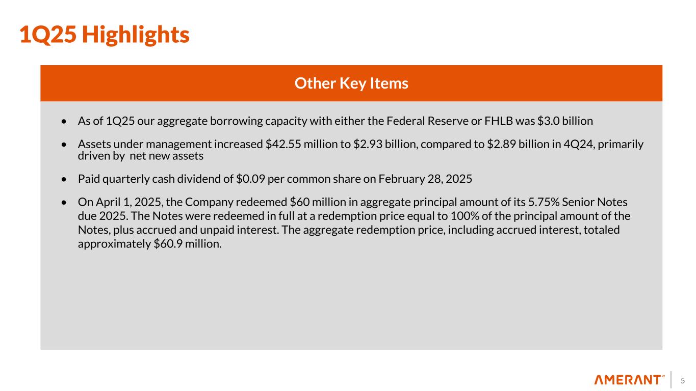 4 1Q25 Highlights Income Statement • Net income attributable to the Company was $12.0 million, down $4.9 million, compared to $16.9 million in 4Q24 • Diluted earnings per share was $0.28, compared to diluted earnings per share of $0.40 in 4Q24 • Net Interest Margin ("NIM") was 3.75%, unchanged from 4Q24 • Net Interest Income (“NII”) was $85.9 million, down $1.7 million, from $87.6 million in 4Q24 • Non-interest Income was $19.5 million, a decrease of $4.2 million, from $23.7 million in 4Q24. • Provision for credit losses was $18.4 million, up by $8.5 million, compared to $9.9 million in 4Q24 • Non-interest Expense was $71.6 million, down $11.8 million, from $83.4 million in 4Q24 • Pre-provision net revenue (“PPNR”) (1) was $33.9 million, up by $5.9 million, compared to PPNR of $27.9 million in 4Q24 (1) Non-GAAP Financial Measure. See Appendix 1 for a reconciliation to GAAP.