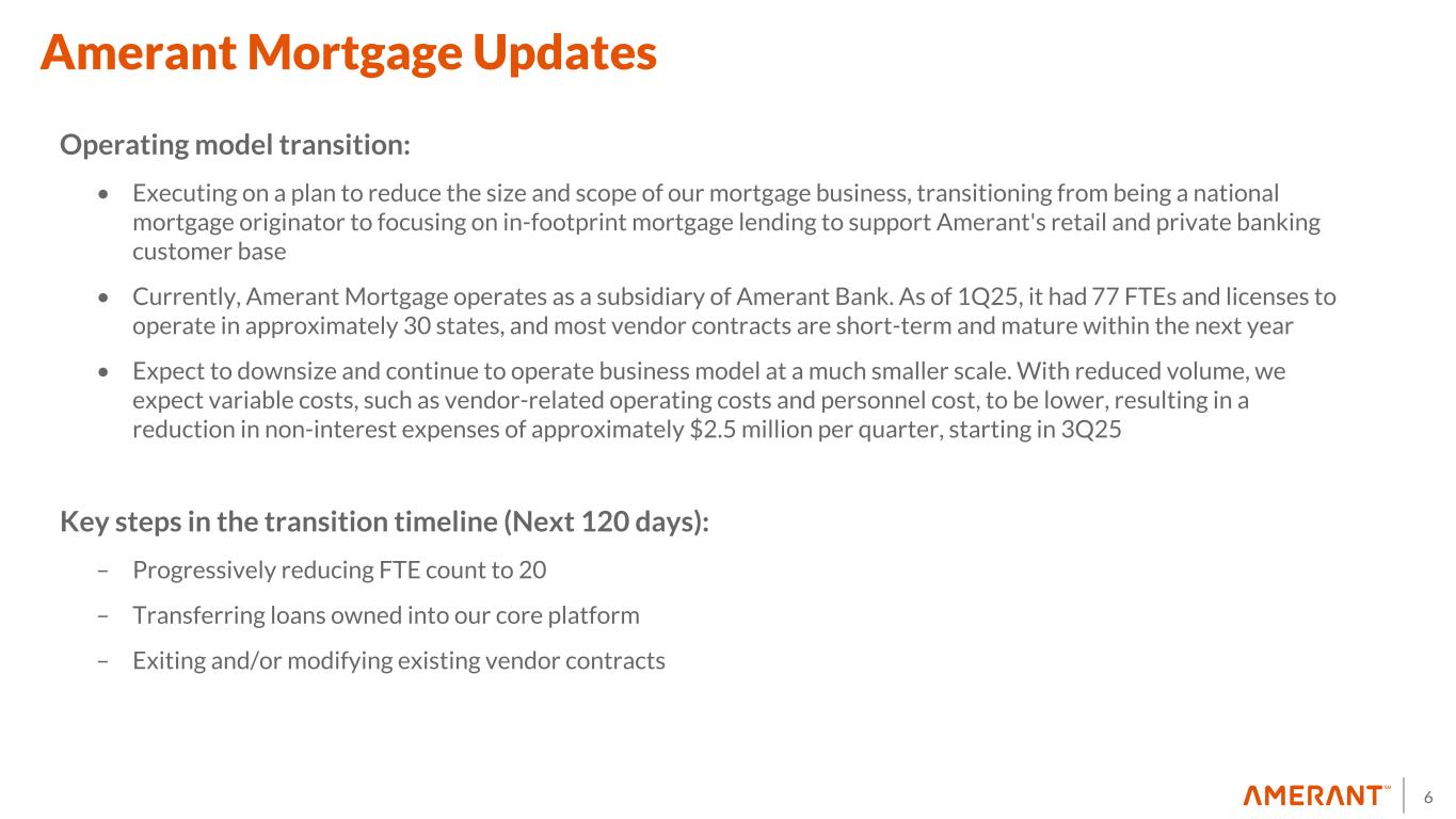 5 1Q25 Highlights Other Key Items • As of 1Q25 our aggregate borrowing capacity with either the Federal Reserve or FHLB was $3.0 billion • Assets under management increased $42.55 million to $2.93 billion, compared to $2.89 billion in 4Q24, primarily driven by net new assets • Paid quarterly cash dividend of $0.09 per common share on February 28, 2025 • On April 1, 2025, the Company redeemed $60 million in aggregate principal amount of its 5.75% Senior Notes due 2025. The Notes were redeemed in full at a redemption price equal to 100% of the principal amount of the Notes, plus accrued and unpaid interest. The aggregate redemption price, including accrued interest, totaled approximately $60.9 million.