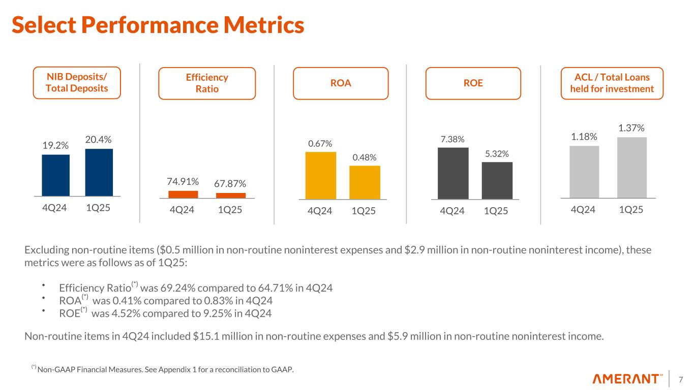 6 Amerant Mortgage Updates Operating model transition: • Executing on a plan to reduce the size and scope of our mortgage business, transitioning from being a national mortgage originator to focusing on in-footprint mortgage lending to support Amerant's retail and private banking customer base • Currently, Amerant Mortgage operates as a subsidiary of Amerant Bank. As of 1Q25, it had 77 FTEs and licenses to operate in approximately 30 states, and most vendor contracts are short-term and mature within the next year • Expect to downsize and continue to operate business model at a much smaller scale. With reduced volume, we expect variable costs, such as vendor-related operating costs and personnel cost, to be lower, resulting in a reduction in non-interest expenses of approximately $2.5 million per quarter, starting in 3Q25 Key steps in the transition timeline (Next 120 days): – Progressively reducing FTE count to 20 – Transferring loans owned into our core platform – Exiting and/or modifying existing vendor contracts