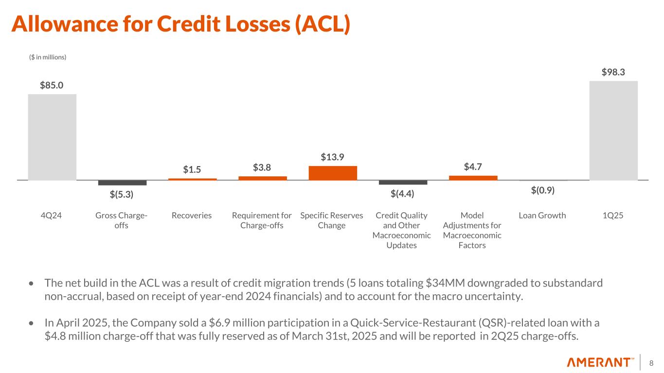 7 74.91% 67.87% 4Q24 1Q25 19.2% 20.4% 4Q24 1Q25 1.18% 1.37% 4Q24 1Q25 0.67% 0.48% 4Q24 1Q25 7.38% 5.32% 4Q24 1Q25 NIB Deposits/ Total Deposits Efficiency Ratio ACL / Total Loans held for investment ROA ROE Select Performance Metrics Excluding non-routine items ($0.5 million in non-routine noninterest expenses and $2.9 million in non-routine noninterest income), these metrics were as follows as of 1Q25: • Efficiency Ratio(*) was 69.24% compared to 64.71% in 4Q24 • ROA(*) was 0.41% compared to 0.83% in 4Q24 • ROE(*) was 4.52% compared to 9.25% in 4Q24 Non-routine items in 4Q24 included $15.1 million in non-routine expenses and $5.9 million in non-routine noninterest income. (*) Non-GAAP Financial Measures. See Appendix 1 for a reconciliation to GAAP.