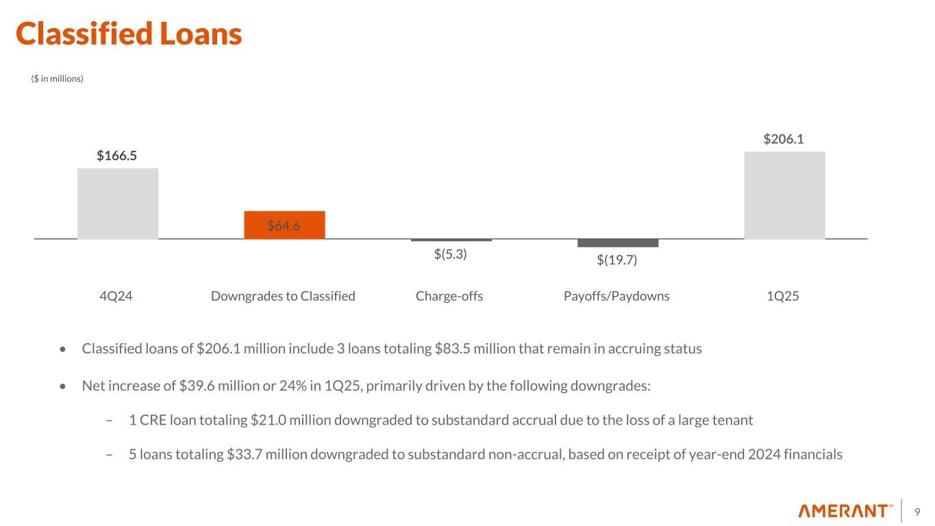 8 $85.0 $(5.3) $1.5 $3.8 $13.9 $(4.4) $4.7 $(0.9) $98.3 4Q24 Gross Charge- offs Recoveries Requirement for Charge-offs Specific Reserves Change Credit Quality and Other Macroeconomic Updates Model Adjustments for Macroeconomic Factors Loan Growth 1Q25 ($ in millions) Allowance for Credit Losses (ACL) • The net build in the ACL was a result of credit migration trends (5 loans totaling $34MM downgraded to substandard non-accrual, based on receipt of year-end 2024 financials) and to account for the macro uncertainty. • In April 2025, the Company sold a $6.9 million participation in a Quick-Service-Restaurant (QSR)-related loan with a $4.8 million charge-off that was fully reserved as of March 31st, 2025 and will be reported in 2Q25 charge-offs.