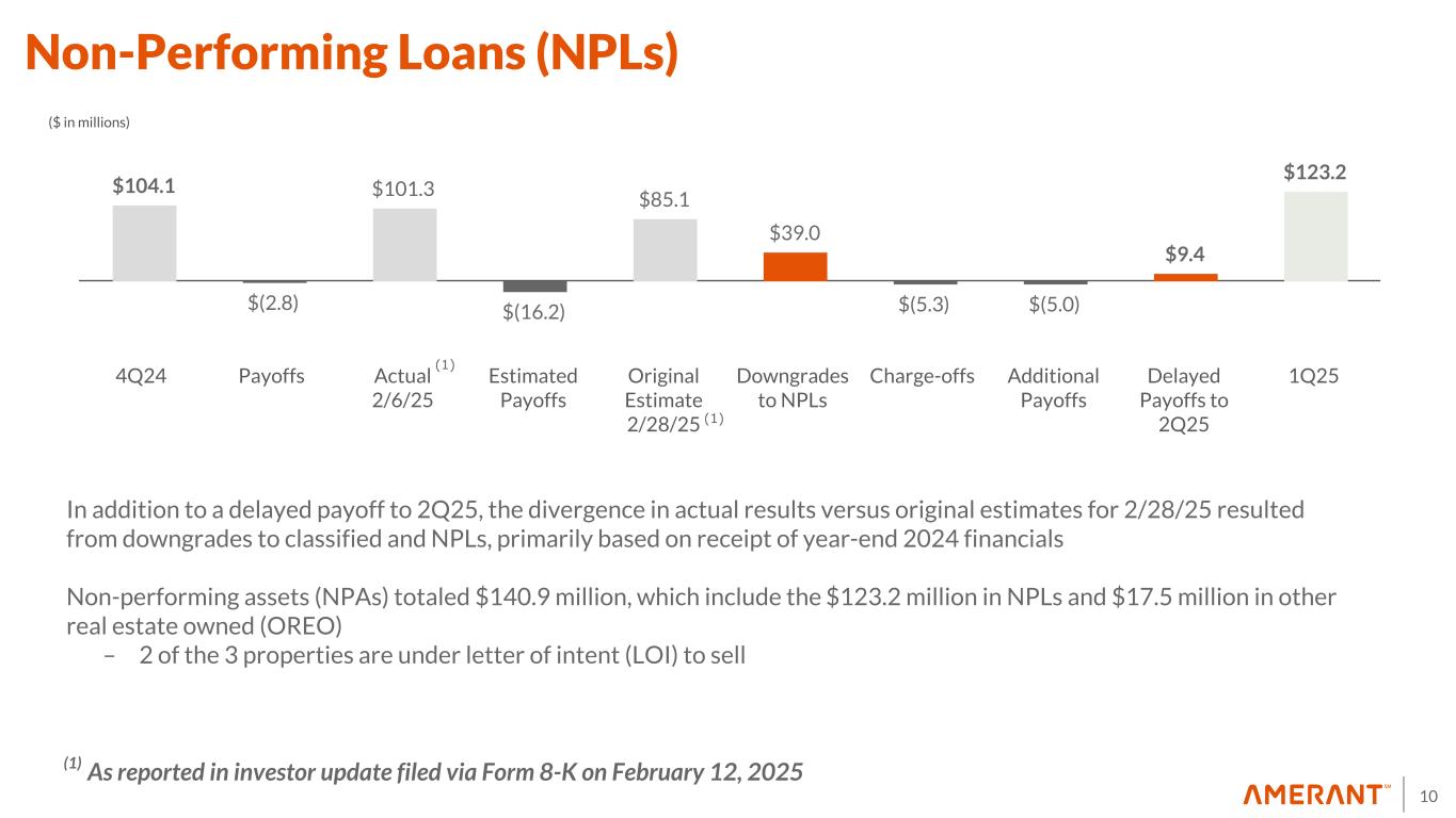 9 Classified Loans $166.5 $64.6 $(5.3) $(19.7) $206.1 4Q24 Downgrades to Classified Charge-offs Payoffs/Paydowns 1Q25 ($ in millions) • Classified loans of $206.1 million include 3 loans totaling $83.5 million that remain in accruing status • Net increase of $39.6 million or 24% in 1Q25, primarily driven by the following downgrades: – 1 CRE loan totaling $21.0 million downgraded to substandard accrual due to the loss of a large tenant – 5 loans totaling $33.7 million downgraded to substandard non-accrual, based on receipt of year-end 2024 financials