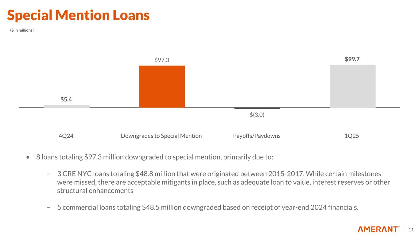 10 Non-Performing Loans (NPLs) ($ in millions) In addition to a delayed payoff to 2Q25, the divergence in actual results versus original estimates for 2/28/25 resulted from downgrades to classified and NPLs, primarily based on receipt of year-end 2024 financials Non-performing assets (NPAs) totaled $140.9 million, which include the $123.2 million in NPLs and $17.5 million in other real estate owned (OREO) – 2 of the 3 properties are under letter of intent (LOI) to sell $104.1 $(2.8) $101.3 $(16.2) $85.1 $39.0 $(5.3) $(5.0) $9.4 $123.2 4Q24 Payoffs Actual 2/6/25 Estimated Payoffs Original Estimate 2/28/25 Downgrades to NPLs Charge-offs Additional Payoffs Delayed Payoffs to 2Q25 1Q25 (1) (1) (1) As reported in investor update filed via Form 8-K on February 12, 2025