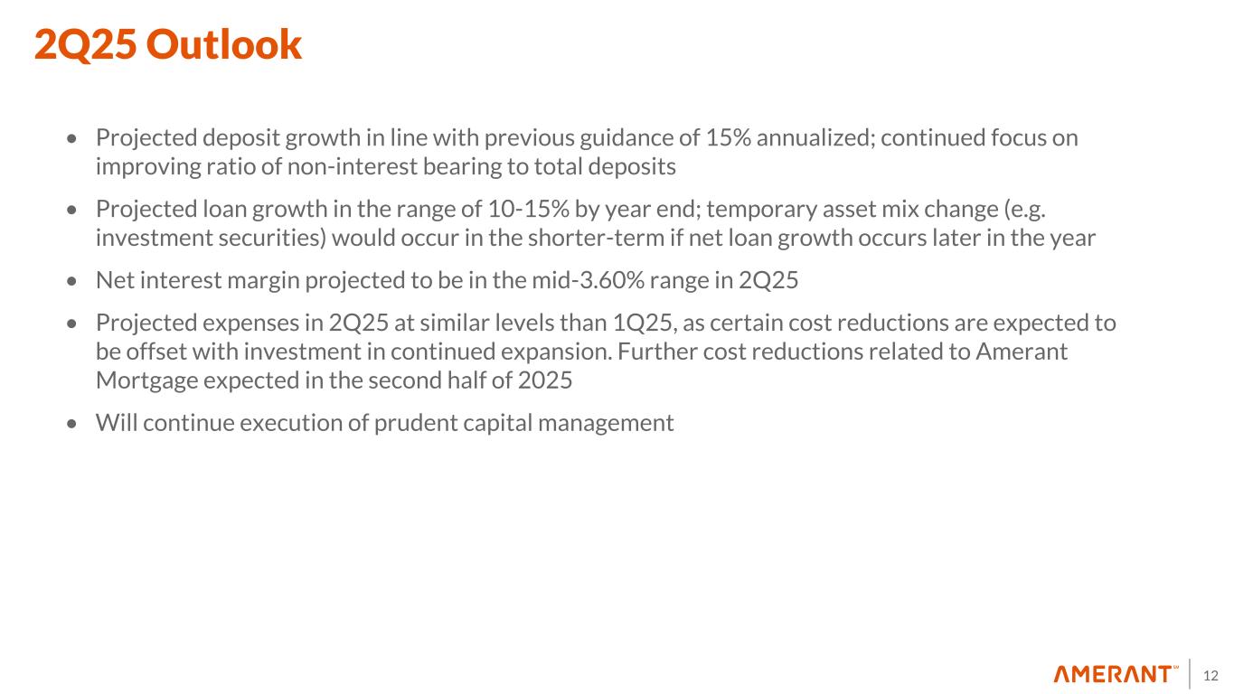 11 • 8 loans totaling $97.3 million downgraded to special mention, primarily due to: – 3 CRE NYC loans totaling $48.8 million that were originated between 2015-2017. While certain milestones were missed, there are acceptable mitigants in place, such as adequate loan to value, interest reserves or other structural enhancements – 5 commercial loans totaling $48.5 million downgraded based on receipt of year-end 2024 financials. Special Mention Loans $5.4 $97.3 $(3.0) $99.7 4Q24 Downgrades to Special Mention Payoffs/Paydowns 1Q25 ($ in millions)