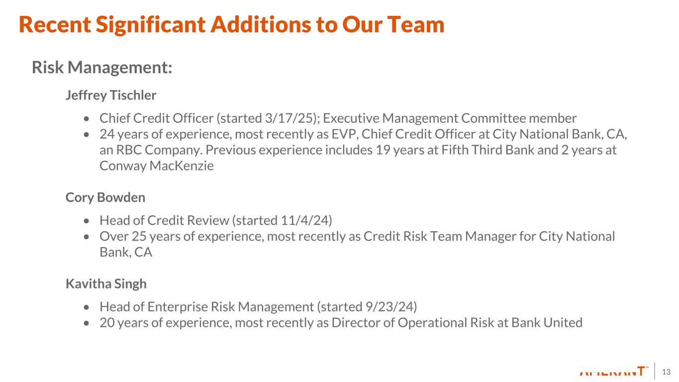 12 2Q25 Outlook • Projected deposit growth in line with previous guidance of 15% annualized; continued focus on improving ratio of non-interest bearing to total deposits • Projected loan growth in the range of 10-15% by year end; temporary asset mix change (e.g. investment securities) would occur in the shorter-term if net loan growth occurs later in the year • Net interest margin projected to be in the mid-3.60% range in 2Q25 • Projected expenses in 2Q25 at similar levels than 1Q25, as certain cost reductions are expected to be offset with investment in continued expansion. Further cost reductions related to Amerant Mortgage expected in the second half of 2025 • Will continue execution of prudent capital management