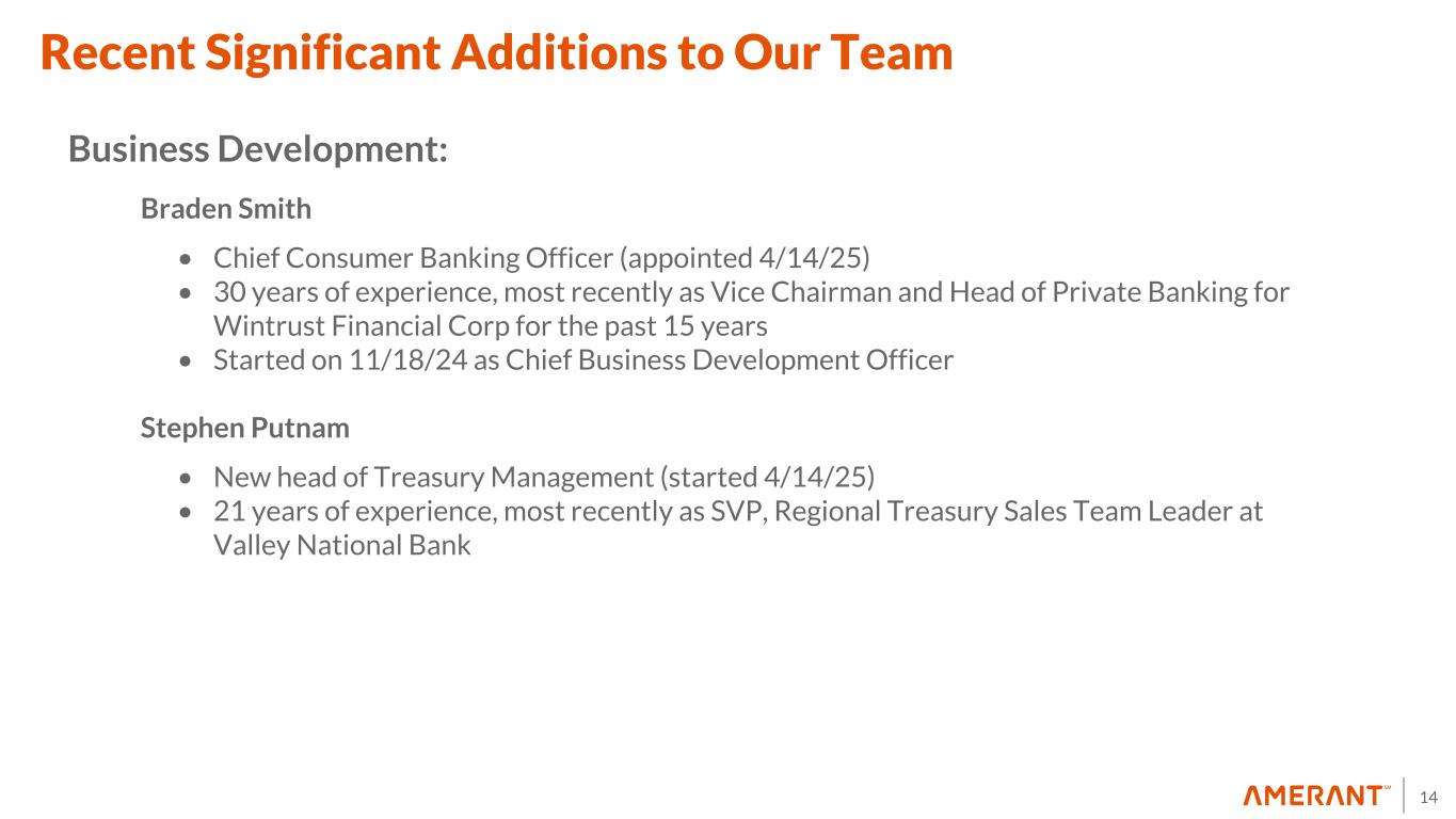 13 Recent Significant Additions to Our Team Risk Management: Jeffrey Tischler • Chief Credit Officer (started 3/17/25); Executive Management Committee member • 24 years of experience, most recently as EVP, Chief Credit Officer at City National Bank, CA, an RBC Company. Previous experience includes 19 years at Fifth Third Bank and 2 years at Conway MacKenzie Cory Bowden • Head of Credit Review (started 11/4/24) • Over 25 years of experience, most recently as Credit Risk Team Manager for City National Bank, CA Kavitha Singh • Head of Enterprise Risk Management (started 9/23/24) • 20 years of experience, most recently as Director of Operational Risk at Bank United