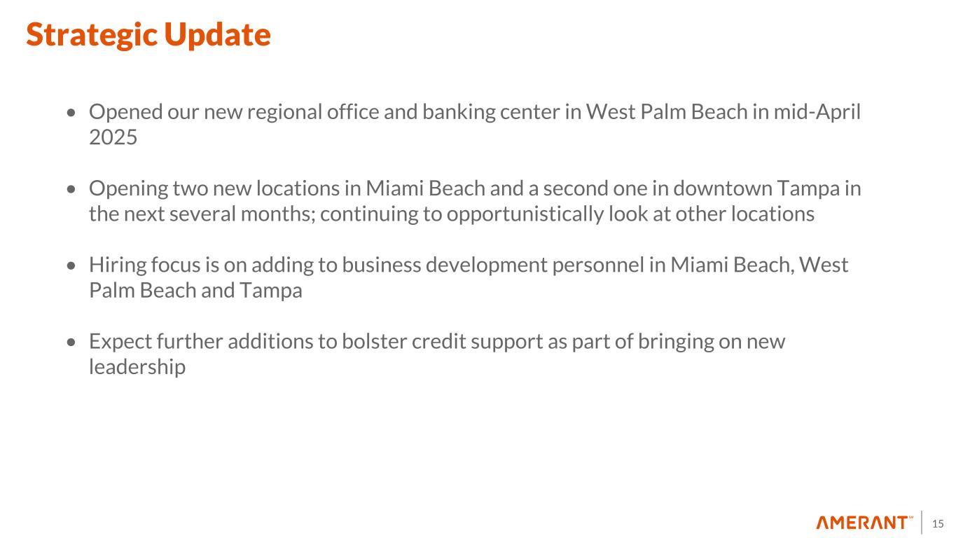 14 Recent Significant Additions to Our Team Business Development: Braden Smith • Chief Consumer Banking Officer (appointed 4/14/25) • 30 years of experience, most recently as Vice Chairman and Head of Private Banking for Wintrust Financial Corp for the past 15 years • Started on 11/18/24 as Chief Business Development Officer Stephen Putnam • New head of Treasury Management (started 4/14/25) • 21 years of experience, most recently as SVP, Regional Treasury Sales Team Leader at Valley National Bank