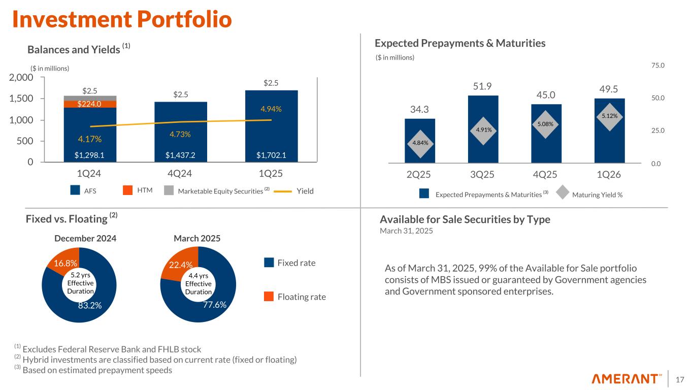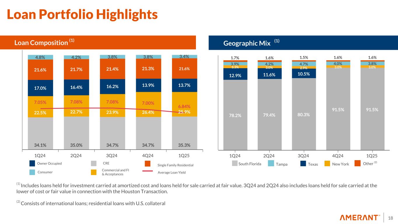 17 77.6% 22.4% $1,298.1 $1,437.2 $1,702.1 $224.0 $2.5 $2.5 $2.5 4.17% 4.73% 4.94% 1Q24 4Q24 1Q25 0 500 1,000 1,500 2,000 83.2% 16.8% Balances and Yields (1) AFS HTM Fixed vs. Floating (2) March 2025 Floating rate Fixed rate Available for Sale Securities by Type March 31, 2025 5.2 yrs Effective Duration ($ in millions) Marketable Equity Securities (2) (1) Excludes Federal Reserve Bank and FHLB stock (2) Hybrid investments are classified based on current rate (fixed or floating) (3) Based on estimated prepayment speeds Yield 4.4 yrs Effective Duration 34.3 51.9 45.0 49.5 2Q25 3Q25 4Q25 1Q26 0.0 25.0 50.0 75.0 ($ in millions) Expected Prepayments & Maturities Expected Prepayments & Maturities (3) Maturing Yield % Investment Portfolio 4.84% 4.91% 5.08% 5.12% December 2024 As of March 31, 2025, 99% of the Available for Sale portfolio consists of MBS issued or guaranteed by Government agencies and Government sponsored enterprises.
