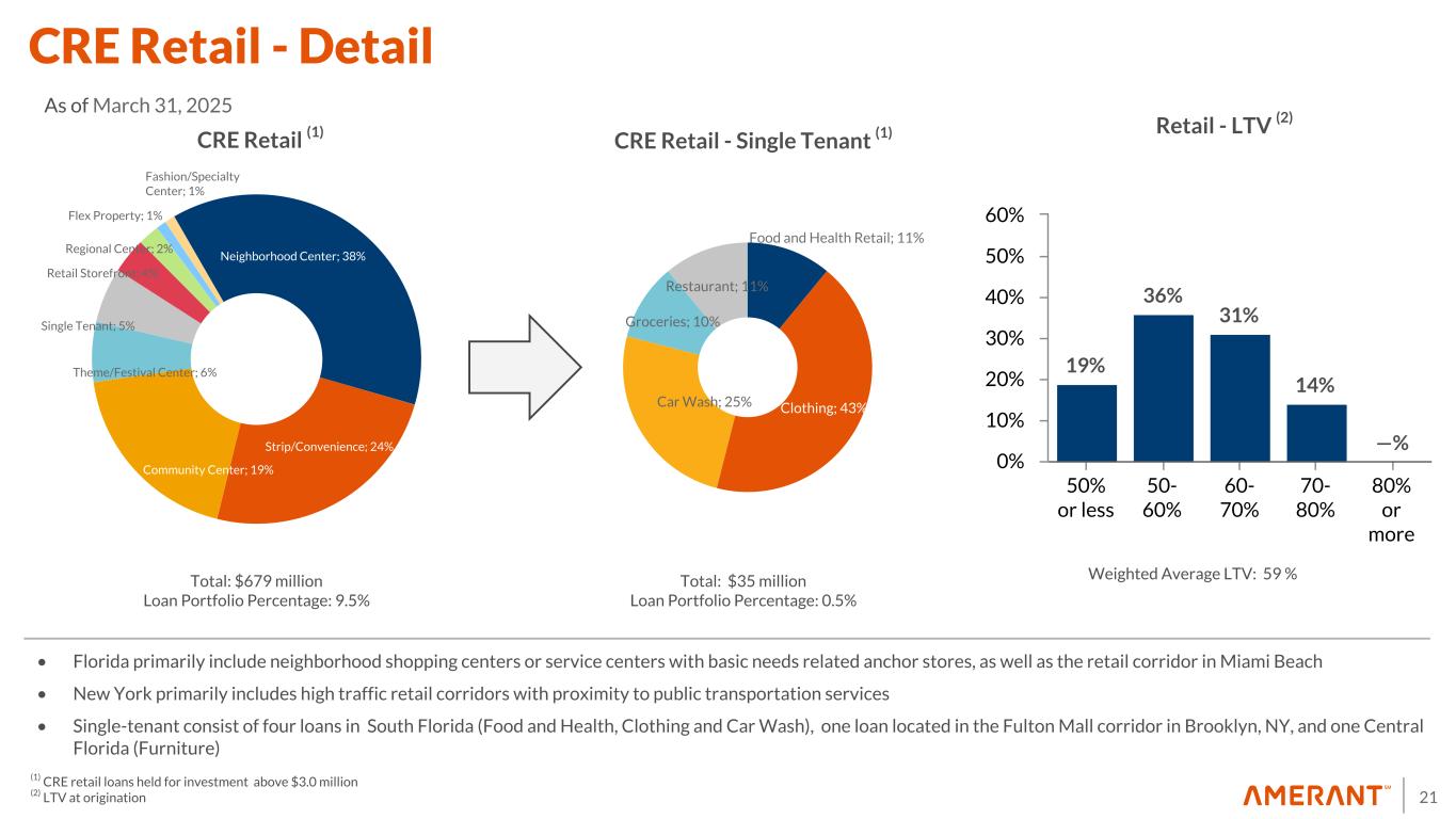 20 CRE Type FL TX NY Other Total % Total CRE % Total Loans (1) Income Producing (2) Land and Construction Retail $ 563 $ 19 $ 83 $ 13 $ 678 26.7 % 9.5 % $ 673 $ 5 Multifamily $ 293 $ 76 $ 83 $ — $ 452 17.8 % 6.3 % $ 401 $ 51 Office $ 304 $ 42 $ 40 $ 25 $ 411 16.2 % 5.7 % $ 411 $ — Hotels $ 254 $ 47 $ — $ — $ 301 11.9 % 4.2 % $ 293 $ 8 Industrial $ 59 $ 4 $ 15 $ — $ 78 3.0 % 1.1 % $ 78 $ — Specialty $ 148 $ — $ — $ 48 $ 196 7.7 % 2.7 % $ 185 $ 11 Land $ 361 $ 4 $ — $ 60 $ 425 16.7 % 5.9 % $ — $ 425 Total CRE $ 1,982 $ 192 $ 221 $ 146 $ 2,541 100.0 % 35.4 % $ 2,041 $ 500 Outstanding as of March 31, 2025 ($ in millions) (1) Calculated as a percentage of loans held for investment only. (2) Income producing properties include non-owner occupied and multi-family residential loans. CRE Loans Held For Investment - Detail