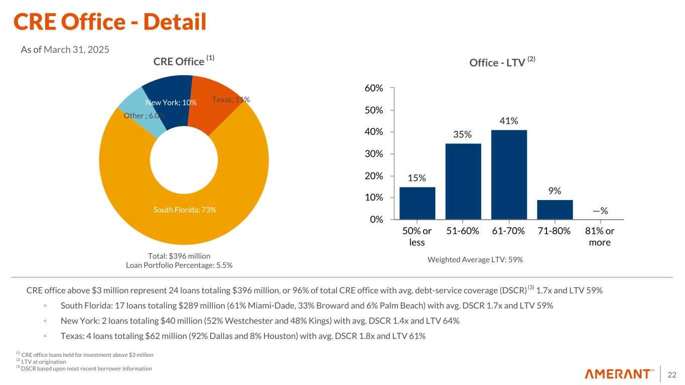 21 19% 36% 31% 14% —% 50% or less 50- 60% 60- 70% 70- 80% 80% or more 0% 10% 20% 30% 40% 50% 60% • Florida primarily include neighborhood shopping centers or service centers with basic needs related anchor stores, as well as the retail corridor in Miami Beach • New York primarily includes high traffic retail corridors with proximity to public transportation services • Single-tenant consist of four loans in South Florida (Food and Health, Clothing and Car Wash), one loan located in the Fulton Mall corridor in Brooklyn, NY, and one Central Florida (Furniture) CRE Retail (1) Retail - LTV (2) Food and Health Retail; 11% Clothing; 43%Car Wash; 25% Groceries; 10% Restaurant; 11% CRE Retail - Single Tenant (1) (1) CRE retail loans held for investment above $3.0 million (2) LTV at origination Total: $679 million Loan Portfolio Percentage: 9.5% Total: $35 million Loan Portfolio Percentage: 0.5% Neighborhood Center; 38% Strip/Convenience; 24% Community Center; 19% Theme/Festival Center; 6% Single Tenant; 5% Retail Storefront; 4% Regional Center; 2% Flex Property; 1% Fashion/Specialty Center; 1% CRE Retail - Detail As of March 31, 2025 Weighted Average LTV: 59 %