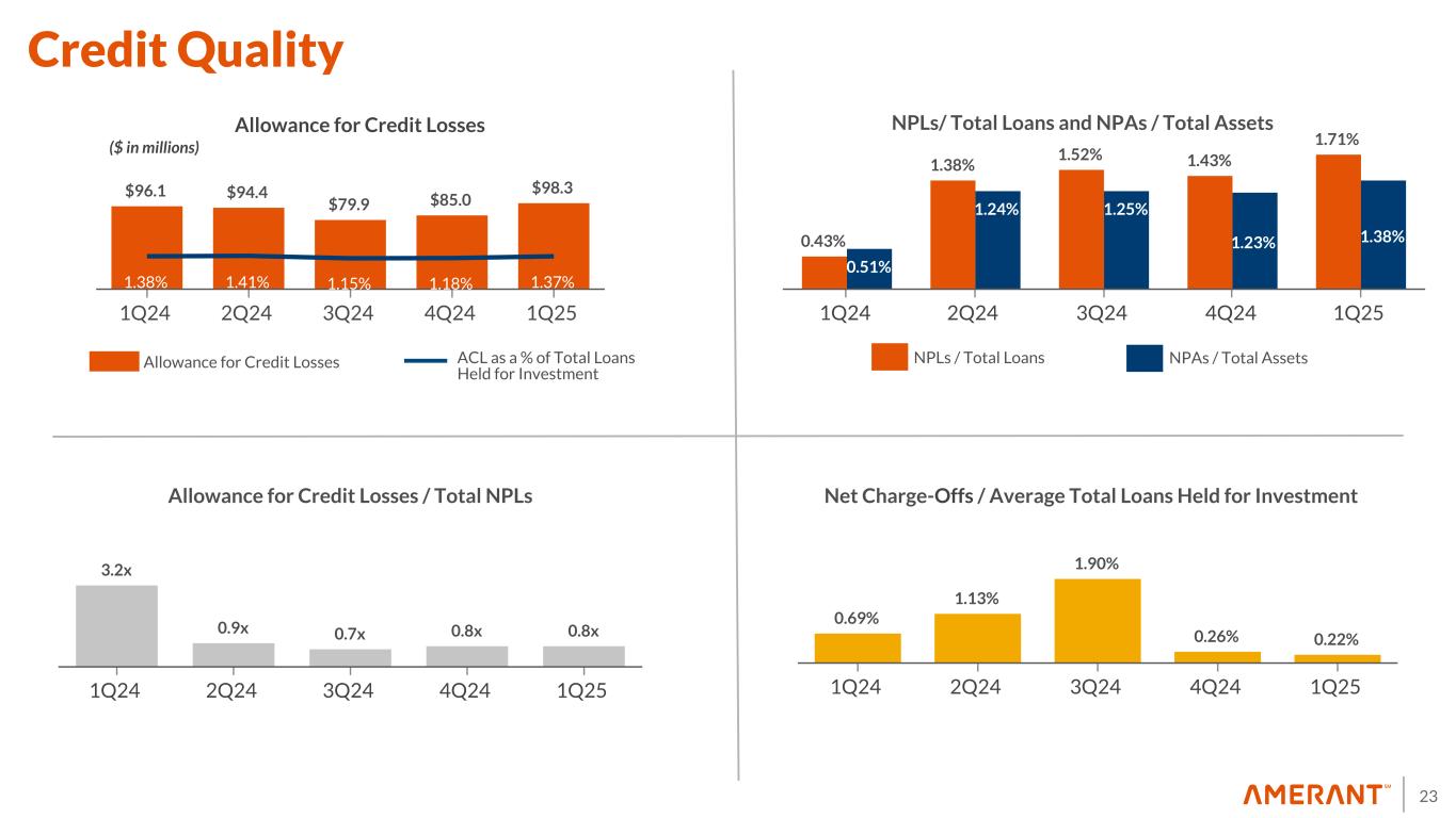 23 0.43% 1.38% 1.52% 1.43% 1.71% 0.51% 1.24% 1.25% 1.23% 1.38% 1Q24 2Q24 3Q24 4Q24 1Q25 3.2x 0.9x 0.7x 0.8x 0.8x 1Q24 2Q24 3Q24 4Q24 1Q25 $96.1 $94.4 $79.9 $85.0 $98.3 1.38% 1.41% 1.15% 1.18% 1.37% 1Q24 2Q24 3Q24 4Q24 1Q25 0.69% 1.13% 1.90% 0.26% 0.22% 1Q24 2Q24 3Q24 4Q24 1Q25 Net Charge-Offs / Average Total Loans Held for Investment Allowance for Credit Losses ($ in millions) NPLs/ Total Loans and NPAs / Total Assets Allowance for Credit Losses / Total NPLs Allowance for Credit Losses ACL as a % of Total Loans Held for Investment NPLs / Total Loans NPAs / Total Assets Credit Quality