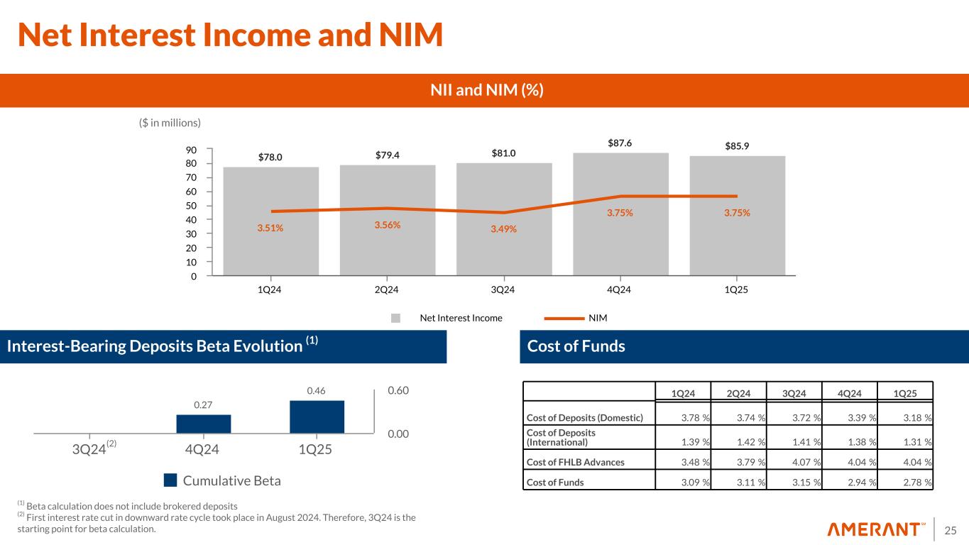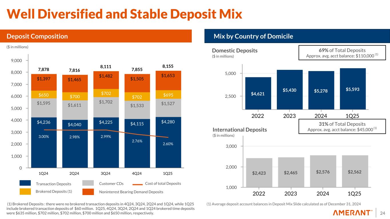 24 7,878 7,816 8,111 7,855 8,155 $4,236 $4,040 $4,225 $4,115 $4,280 $1,595 $1,611 $1,702 $1,533 $1,527 $650 $700 $702 $702 $695 $1,397 $1,465 $1,482 $1,505 $1,653 3.00% 2.98% 2.99% 2.76% 2.60% 1Q24 2Q24 3Q24 4Q24 1Q25 0 1,000 2,000 3,000 4,000 5,000 6,000 7,000 8,000 9,000 $2,423 $2,465 $2,576 $2,562 2022 2023 2024 1Q25 1,000 2,000 3,000 $4,621 $5,430 $5,278 $5,593 2022 2023 2024 1Q25 2,500 5,000 Domestic Deposits ($ in millions) Deposit Composition International Deposits ($ in millions) Mix by Country of Domicile Transaction Deposits Customer CDs Brokered Deposits (1) Cost of total Deposits ($ in millions) Noninterest Bearing Demand Deposits 31% of Total Deposits Approx. avg. acct balance: $45,000 (1) 69% of Total Deposits Approx. avg. acct balance: $110,000 (1) Well Diversified and Stable Deposit Mix (1) Average deposit account balances in Deposit Mix Slide calculated as of December 31, 2024 (1) Brokered Deposits : there were no brokered transaction deposits in 4Q24, 3Q24, 2Q24 and 1Q24, while 1Q25 include brokered transaction deposits of $60 million. 1Q25, 4Q24, 3Q24, 2Q24 and 1Q24 brokered time deposits were $635 million, $702 million, $702 million, $700 million and $650 million, respectively.