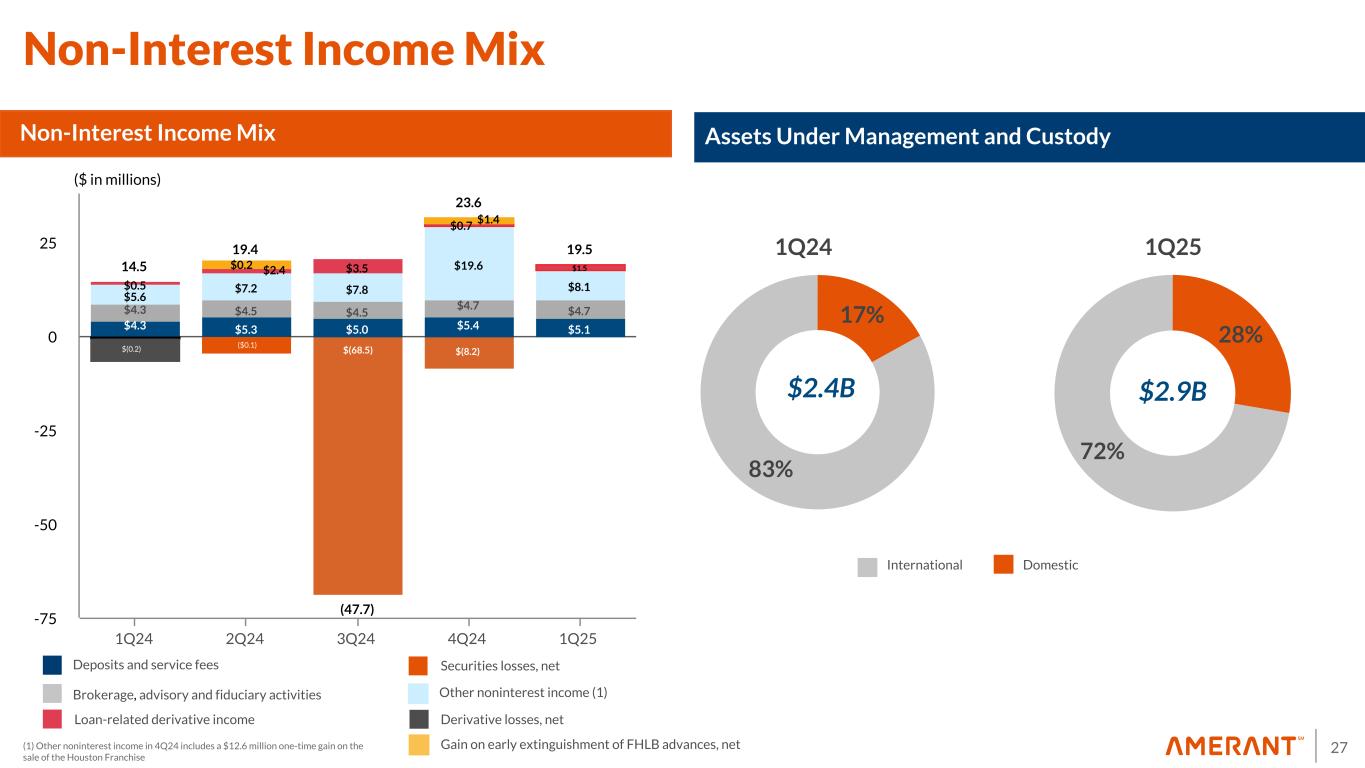 27 14.5 19.4 23.6 19.5 (47.7) $4.3 $5.3 $5.0 $5.4 $5.1 $4.3 $4.5 $4.5 $4.7 $4.7 $(68.5) $(8.2) $5.6 $7.2 $7.8 $19.6 $8.1$0.5 $3.5 $1.5 1Q24 2Q24 3Q24 4Q24 1Q25 -75 -50 -25 0 25 17% 83% 28% 72% Non-Interest Income Mix Deposits and service fees Brokerage, advisory and fiduciary activities Other noninterest income (1) DomesticInternational 1Q24 $2.9B ($ in millions) Securities losses, net Loan-related derivative income Derivative losses, net Gain on early extinguishment of FHLB advances, net Non-Interest Income Mix $2.4B Assets Under Management and Custody 1Q25 $(0.2) (1) Other noninterest income in 4Q24 includes a $12.6 million one-time gain on the sale of the Houston Franchise $(0.2) ($0.1) $1.4 $0.7 $2.4$0.2