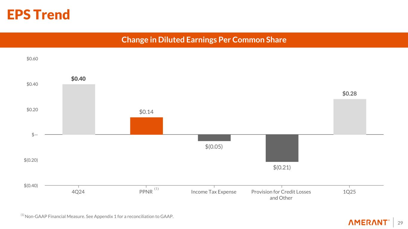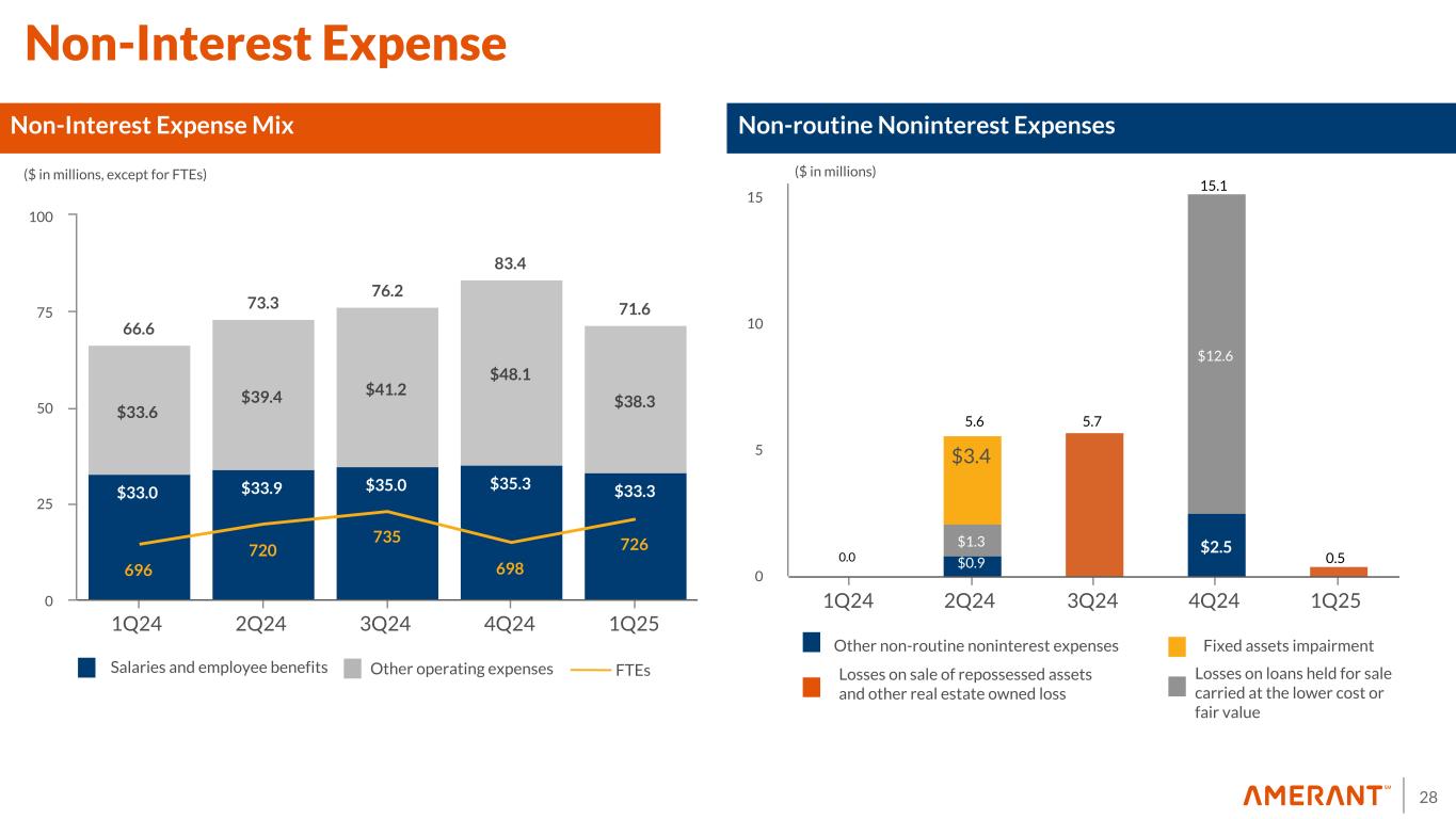 28 66.6 73.3 76.2 83.4 71.6 $33.0 $33.9 $35.0 $35.3 $33.3 $33.6 $39.4 $41.2 $48.1 $38.3 696 720 735 698 726 1Q24 2Q24 3Q24 4Q24 1Q25 0 25 50 75 100 Non-Interest Expense Mix ($ in millions, except for FTEs) Non-routine Noninterest Expenses $0.9 $2.5$1.3 $12.6 $3.4 1Q24 2Q24 3Q24 4Q24 1Q25 0 5 10 15 ($ in millions) Non-Interest Expense Salaries and employee benefits Other operating expenses FTEs Other non-routine noninterest expenses Losses on loans held for sale carried at the lower cost or fair value Fixed assets impairment Losses on sale of repossessed assets and other real estate owned loss .9 0.0 5.6 5.7 15.1 0.5