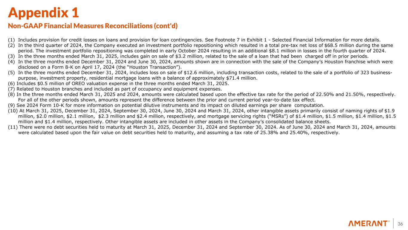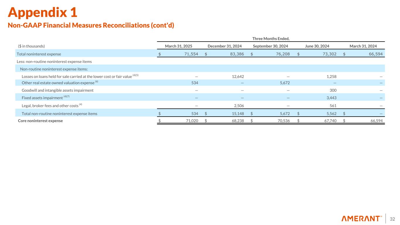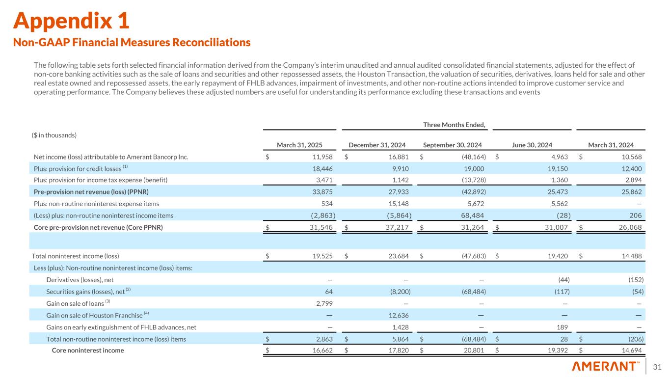 31 Appendix 1 Non-GAAP Financial Measures Reconciliations The following table sets forth selected financial information derived from the Company’s interim unaudited and annual audited consolidated financial statements, adjusted for the effect of non-core banking activities such as the sale of loans and securities and other repossessed assets, the Houston Transaction, the valuation of securities, derivatives, loans held for sale and other real estate owned and repossessed assets, the early repayment of FHLB advances, impairment of investments, and other non-routine actions intended to improve customer service and operating performance. The Company believes these adjusted numbers are useful for understanding its performance excluding these transactions and events Three Months Ended, ($ in thousands) March 31, 2025 December 31, 2024 September 30, 2024 June 30, 2024 March 31, 2024 Net income (loss) attributable to Amerant Bancorp Inc. $ 11,958 $ 16,881 $ (48,164) $ 4,963 $ 10,568 Plus: provision for credit losses (1) 18,446 9,910 19,000 19,150 12,400 Plus: provision for income tax expense (benefit) 3,471 1,142 (13,728) 1,360 2,894 Pre-provision net revenue (loss) (PPNR) 33,875 27,933 (42,892) 25,473 25,862 Plus: non-routine noninterest expense items 534 15,148 5,672 5,562 — (Less) plus: non-routine noninterest income items (2,863) (5,864) 68,484 (28) 206 Core pre-provision net revenue (Core PPNR) $ 31,546 $ 37,217 $ 31,264 $ 31,007 $ 26,068 Total noninterest income (loss) $ 19,525 $ 23,684 $ (47,683) $ 19,420 $ 14,488 Less (plus): Non-routine noninterest income (loss) items: Derivatives (losses), net — — — (44) (152) Securities gains (losses), net (2) 64 (8,200) (68,484) (117) (54) Gain on sale of loans (3) 2,799 — — — — Gain on sale of Houston Franchise (4) — 12,636 — — — Gains on early extinguishment of FHLB advances, net — 1,428 — 189 — Total non-routine noninterest income (loss) items $ 2,863 $ 5,864 $ (68,484) $ 28 $ (206) Core noninterest income $ 16,662 $ 17,820 $ 20,801 $ 19,392 $ 14,694