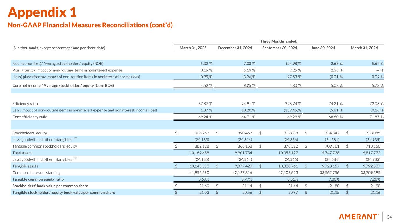 33 Three Months Ended, ($ in thousands, except percentages and per share data) March 31, 2025 December 31, 2024 September 30, 2024 June 30, 2024 March 31, 2024 Net income (loss) attributable to Amerant Bancorp Inc. $ 11,958 $ 16,881 $ (48,164) $ 4,963 $ 10,568 Plus after-tax non-routine items in noninterest expense: Non-routine items in noninterest expense before income tax effect 534 15,148 5,672 5,562 — Income tax effect (8) (120) (3,409) (1,332) (1,196) — Total after-tax non-routine items in noninterest expense 414 11,739 4,340 4,366 — (Less) plus after-tax non-routine items in noninterest income: Non-routine items in noninterest income (loss) before income tax effect (2,863) (5,864) 68,484 (28) 206 Income tax effect (8) 644 (1,596) (15,411) 6 (44) Total after-tax non-routine items in noninterest income (loss) (2,219) (7,460) 53,073 (22) 162 Core net income $ 10,153 $ 21,160 $ 9,249 $ 9,307 $ 10,730 Basic earnings (loss) per share $ 0.28 $ 0.40 $ (1.43) $ 0.15 $ 0.32 Plus: after tax impact of non-routine items in noninterest expense 0.01 0.28 0.13 0.13 — (Less) plus: after tax impact of non-routine items in noninterest income (loss) (0.05) (0.18) 1.57 — — Total core basic earnings per common share $ 0.24 $ 0.50 $ 0.27 $ 0.28 $ 0.32 Diluted earnings (loss) per share (9) $ 0.28 $ 0.40 $ (1.43) $ 0.15 $ 0.31 Plus: after tax impact of non-routine items in noninterest expense 0.01 0.28 0.13 0.13 — (Less) plus: after tax impact of non-routine items in noninterest income (loss) (0.05) (0.18) 1.57 — 0.01 Total core diluted earnings per common share $ 0.24 $ 0.50 $ 0.27 $ 0.28 $ 0.32 Net income (loss) / Average total assets (ROA) 0.48 % 0.67 % (1.92) % 0.21 % 0.44 % Plus: after tax impact of non-routine items in noninterest expense 0.02 % 0.46 % 0.18 % 0.17 % — % (Less) plus: after tax impact of non-routine items in noninterest income (loss) (0.09) % (0.30) % 2.11 % — % — % Core net income / Average total assets (Core ROA) 0.41 % 0.83 % 0.37 % 0.38 % 0.44 % Appendix 1 Non-GAAP Financial Measures Reconciliations (cont'd)