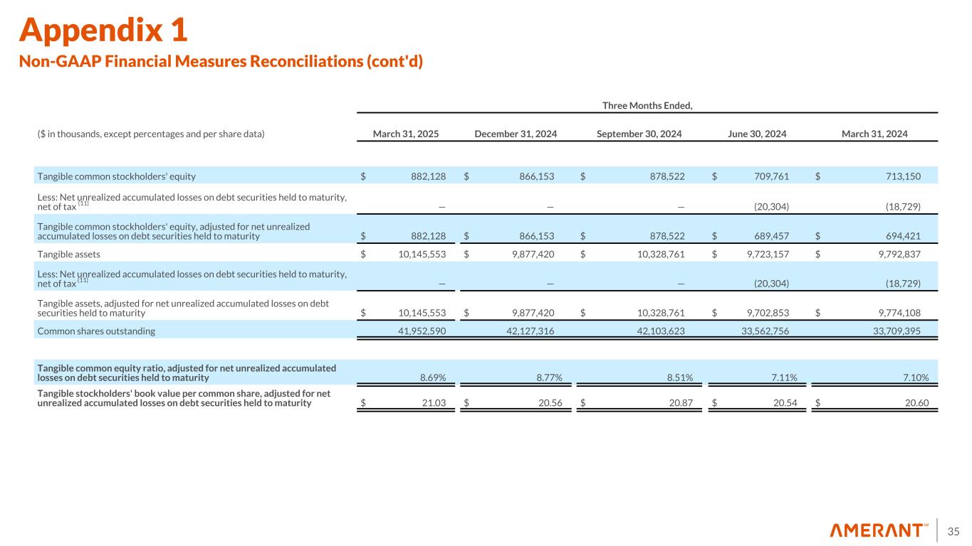 34 Three Months Ended, ($ in thousands, except percentages and per share data) March 31, 2025 December 31, 2024 September 30, 2024 June 30, 2024 March 31, 2024 Net income (loss)/ Average stockholders' equity (ROE) 5.32 % 7.38 % (24.98) % 2.68 % 5.69 % Plus: after tax impact of non-routine items in noninterest expense 0.19 % 5.13 % 2.25 % 2.36 % — % (Less) plus: after tax impact of non-routine items in noninterest income (loss) (0.99) % (3.26) % 27.53 % (0.01) % 0.09 % Core net income / Average stockholders' equity (Core ROE) 4.52 % 9.25 % 4.80 % 5.03 % 5.78 % Efficiency ratio 67.87 % 74.91 % 228.74 % 74.21 % 72.03 % Less: impact of non-routine items in noninterest expense and noninterest income (loss) 1.37 % (10.20) % (159.45) % (5.61) % (0.16) % Core efficiency ratio 69.24 % 64.71 % 69.29 % 68.60 % 71.87 % Stockholders' equity $ 906,263 $ 890,467 $ 902,888 $ 734,342 $ 738,085 Less: goodwill and other intangibles (10) (24,135) (24,314) (24,366) (24,581) (24,935) Tangible common stockholders' equity $ 882,128 $ 866,153 $ 878,522 $ 709,761 $ 713,150 Total assets 10,169,688 9,901,734 10,353,127 9,747,738 9,817,772 Less: goodwill and other intangibles (10) (24,135) (24,314) (24,366) (24,581) (24,935) Tangible assets $ 10,145,553 $ 9,877,420 $ 10,328,761 $ 9,723,157 $ 9,792,837 Common shares outstanding 41,952,590 42,127,316 42,103,623 33,562,756 33,709,395 Tangible common equity ratio 8.69 % 8.77 % 8.51 % 7.30 % 7.28 % Stockholders' book value per common share $ 21.60 $ 21.14 $ 21.44 $ 21.88 $ 21.90 Tangible stockholders' equity book value per common share $ 21.03 $ 20.56 $ 20.87 $ 21.15 $ 21.16 Appendix 1 Non-GAAP Financial Measures Reconciliations (cont'd)