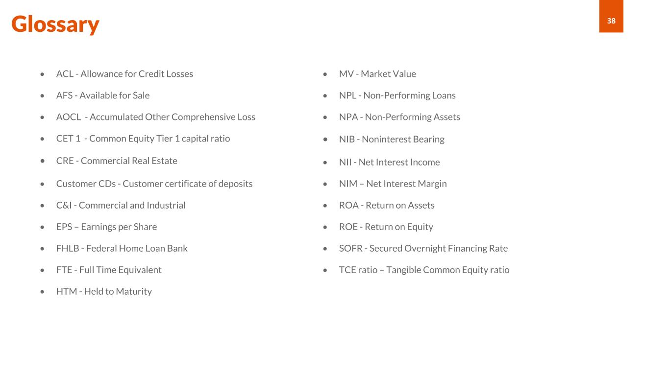 38 • ACL - Allowance for Credit Losses • AFS - Available for Sale • AOCL - Accumulated Other Comprehensive Loss • CET 1 - Common Equity Tier 1 capital ratio • CRE - Commercial Real Estate • Customer CDs - Customer certificate of deposits • C&I - Commercial and Industrial • EPS – Earnings per Share • FHLB - Federal Home Loan Bank • FTE - Full Time Equivalent • HTM - Held to Maturity • MV - Market Value • NPL - Non-Performing Loans • NPA - Non-Performing Assets • NIB - Noninterest Bearing • NII - Net Interest Income • NIM – Net Interest Margin • ROA - Return on Assets • ROE - Return on Equity • SOFR - Secured Overnight Financing Rate • TCE ratio – Tangible Common Equity ratio Glossary