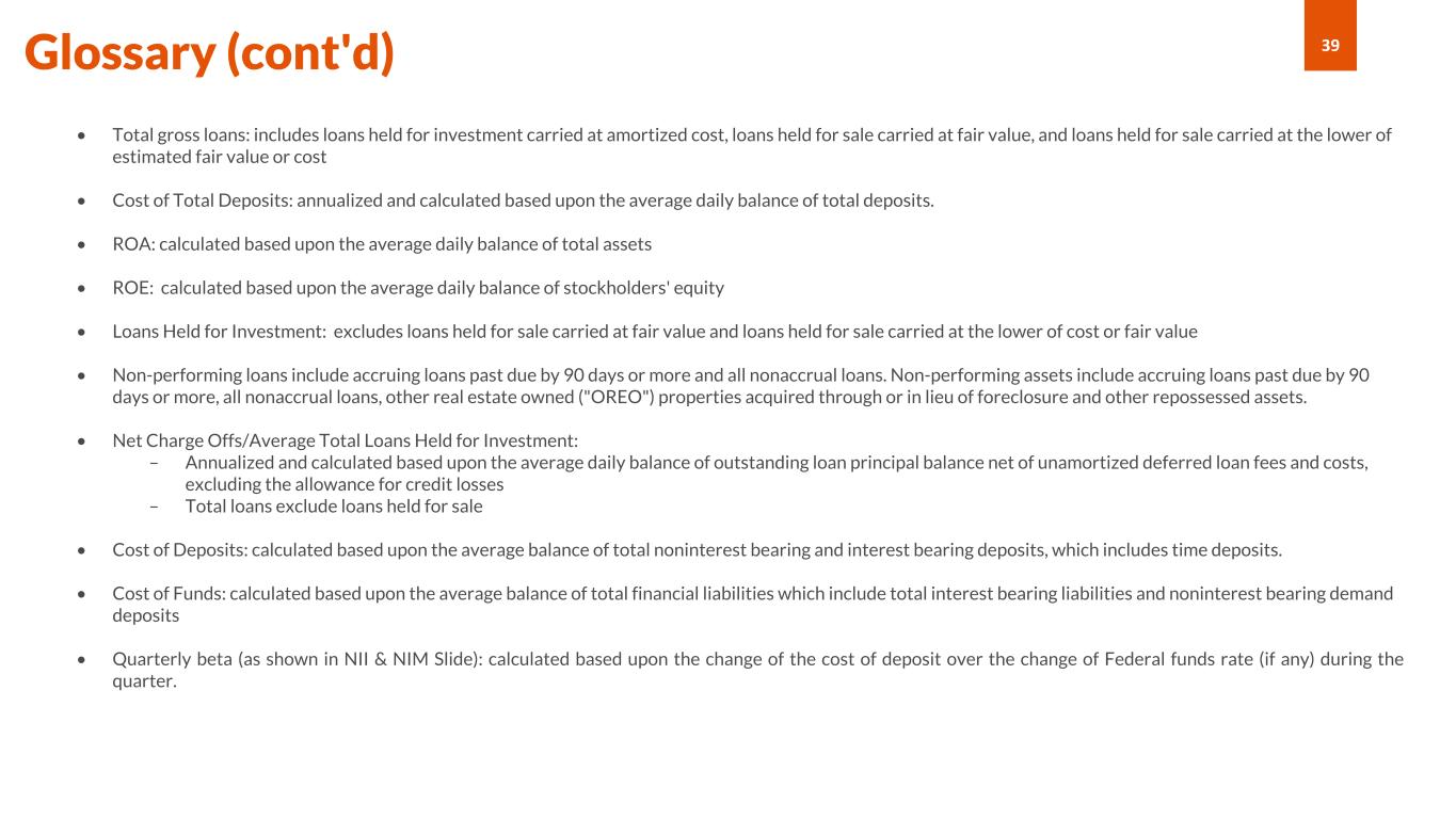 39Glossary (cont'd) • Total gross loans: includes loans held for investment carried at amortized cost, loans held for sale carried at fair value, and loans held for sale carried at the lower of estimated fair value or cost • Cost of Total Deposits: annualized and calculated based upon the average daily balance of total deposits. • ROA: calculated based upon the average daily balance of total assets • ROE: calculated based upon the average daily balance of stockholders' equity • Loans Held for Investment: excludes loans held for sale carried at fair value and loans held for sale carried at the lower of cost or fair value • Non-performing loans include accruing loans past due by 90 days or more and all nonaccrual loans. Non-performing assets include accruing loans past due by 90 days or more, all nonaccrual loans, other real estate owned ("OREO") properties acquired through or in lieu of foreclosure and other repossessed assets. • Net Charge Offs/Average Total Loans Held for Investment: – Annualized and calculated based upon the average daily balance of outstanding loan principal balance net of unamortized deferred loan fees and costs, excluding the allowance for credit losses – Total loans exclude loans held for sale • Cost of Deposits: calculated based upon the average balance of total noninterest bearing and interest bearing deposits, which includes time deposits. • Cost of Funds: calculated based upon the average balance of total financial liabilities which include total interest bearing liabilities and noninterest bearing demand deposits • Quarterly beta (as shown in NII & NIM Slide): calculated based upon the change of the cost of deposit over the change of Federal funds rate (if any) during the quarter.