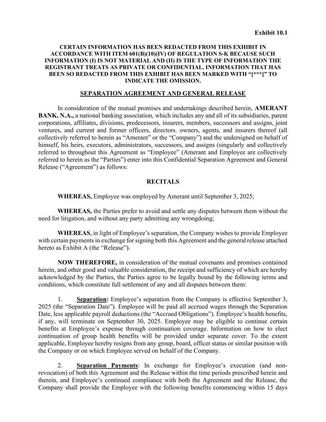 Exhibit 10.1 CERTAIN INFORMATION HAS BEEN REDACTED FROM THIS EXHIBIT IN ACCORDANCE WITH ITEM 601(B)(10)(IV) OF REGULATION S-K BECAUSE SUCH INFORMATION (I) IS NOT MATERIAL AND (II) IS THE TYPE OF INFORMATION THE REGISTRANT TREATS AS PRIVATE OR CONFIDENTIAL. INFORMATION THAT HAS BEEN SO REDACTED FROM THIS EXHIBIT HAS BEEN MARKED WITH “[***]” TO INDICATE THE OMISSION. SEPARATION AGREEMENT AND GENERAL RELEASE In consideration of the mutual promises and undertakings described herein, AMERANT BANK, N.A., a national banking association, which includes any and all of its subsidiaries, parent corporations, affiliates, divisions, predecessors, insurers, members, successors and assigns, joint ventures, and current and former officers, directors. owners, agents, and insurers thereof (all collectively referred to herein as “Amerant” or the “Company”) and the undersigned on behalf of himself, his heirs, executors, administrators, successors, and assigns (singularly and collectively referred to throughout this Agreement as “Employee” (Amerant and Employee are collectively referred to herein as the “Parties”) enter into this Confidential Separation Agreement and General Release (“Agreement”) as follows: RECITALS WHEREAS, Employee was employed by Amerant until September 3, 2025; WHEREAS, the Parties prefer to avoid and settle any disputes between them without the need for litigation, and without any party admitting any wrongdoing; WHEREAS, in light of Employee’s separation, the Company wishes to provide Employee with certain payments in exchange for signing both this Agreement and the general release attached hereto as Exhibit A (the “Release”). NOW THEREFORE, in consideration of the mutual covenants and promises contained herein, and other good and valuable consideration, the receipt and sufficiency of which are hereby acknowledged by the Parties, the Parties agree to be legally bound by the following terms and conditions, which constitute full settlement of any and all disputes between them: 1. Separation: Employee’s separation from the Company is effective September 3, 2025 (the “Separation Date”). Employee will be paid all accrued wages through the Separation Date, less applicable payroll deductions (the “Accrued Obligations”). Employee’s health benefits, if any, will terminate on September 30, 2025. Employee may be eligible to continue certain benefits at Employee’s expense through continuation coverage. Information on how to elect continuation of group health benefits will be provided under separate cover. To the extent applicable, Employee hereby resigns from any group, board, officer status or similar position with the Company or on which Employee served on behalf of the Company. 2. Separation Payments: In exchange for Employee’s execution (and non- revocation) of both this Agreement and the Release within the time periods prescribed herein and therein, and Employee’s continued compliance with both the Agreement and the Release, the Company shall provide the Employee with the following benefits commencing within 15 days