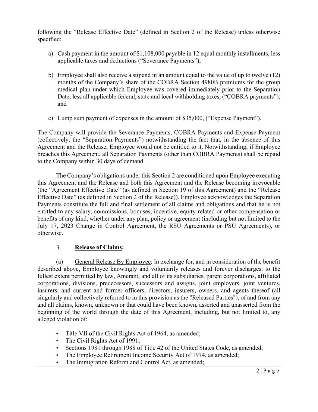 2 | P a g e following the “Release Effective Date” (defined in Section 2 of the Release) unless otherwise specified: a) Cash payment in the amount of $1,108,000 payable in 12 equal monthly installments, less applicable taxes and deductions (“Severance Payments”); b) Employee shall also receive a stipend in an amount equal to the value of up to twelve (12) months of the Company’s share of the COBRA Section 4980B premiums for the group medical plan under which Employee was covered immediately prior to the Separation Date, less all applicable federal, state and local withholding taxes, (“COBRA payments”); and c) Lump sum payment of expenses in the amount of $35,000, (“Expense Payment”). The Company will provide the Severance Payments, COBRA Payments and Expense Payment (collectively, the “Separation Payments”) notwithstanding the fact that, in the absence of this Agreement and the Release, Employee would not be entitled to it. Notwithstanding, if Employee breaches this Agreement, all Separation Payments (other than COBRA Payments) shall be repaid to the Company within 30 days of demand. The Company’s obligations under this Section 2 are conditioned upon Employee executing this Agreement and the Release and both this Agreement and the Release becoming irrevocable (the “Agreement Effective Date” (as defined in Section 19 of this Agreement) and the “Release Effective Date” (as defined in Section 2 of the Release)). Employee acknowledges the Separation Payments constitute the full and final settlement of all claims and obligations and that he is not entitled to any salary, commissions, bonuses, incentive, equity-related or other compensation or benefits of any kind, whether under any plan, policy or agreement (including but not limited to the July 17, 2023 Change in Control Agreement, the RSU Agreements or PSU Agreements), or otherwise. 3. Release of Claims: (a) General Release By Employee: In exchange for, and in consideration of the benefit described above, Employee knowingly and voluntarily releases and forever discharges, to the fullest extent permitted by law, Amerant, and all of its subsidiaries, parent corporations, affiliated corporations, divisions, predecessors, successors and assigns, joint employers, joint ventures, insurers, and current and former officers, directors, insurers, owners, and agents thereof (all singularly and collectively referred to in this provision as the "Released Parties"), of and from any and all claims, known, unknown or that could have been known, asserted and unasserted from the beginning of the world through the date of this Agreement, including, but not limited to, any alleged violation of: • Title VII of the Civil Rights Act of 1964, as amended; • The Civil Rights Act of 1991; • Sections 1981 through 1988 of Title 42 of the United States Code, as amended; • The Employee Retirement Income Security Act of 1974, as amended; • The Immigration Reform and Control Act, as amended;