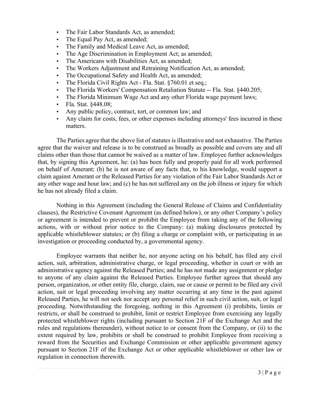 3 | P a g e • The Fair Labor Standards Act, as amended; • The Equal Pay Act, as amended; • The Family and Medical Leave Act, as amended; • The Age Discrimination in Employment Act; as amended; • The Americans with Disabilities Act, as amended; • The Workers Adjustment and Retraining Notification Act, as amended; • The Occupational Safety and Health Act, as amended; • The Florida Civil Rights Act - Fla. Stat. §760.01 et seq.; • The Florida Workers' Compensation Retaliation Statute -- Fla. Stat. §440.205; • The Florida Minimum Wage Act and any other Florida wage payment laws; • Fla. Stat. §448.08; • Any public policy, contract, tort, or common law; and • Any claim for costs, fees, or other expenses including attorneys' fees incurred in these matters. The Parties agree that the above list of statutes is illustrative and not exhaustive. The Parties agree that the waiver and release is to be construed as broadly as possible and covers any and all claims other than those that cannot be waived as a matter of law. Employee further acknowledges that, by signing this Agreement, he: (a) has been fully and properly paid for all work performed on behalf of Amerant; (b) he is not aware of any facts that, to his knowledge, would support a claim against Amerant or the Released Parties for any violation of the Fair Labor Standards Act or any other wage and hour law; and (c) he has not suffered any on the job illness or injury for which he has not already filed a claim. Nothing in this Agreement (including the General Release of Claims and Confidentiality clauses), the Restrictive Covenant Agreement (as defined below), or any other Company’s policy or agreement is intended to prevent or prohibit the Employee from taking any of the following actions, with or without prior notice to the Company: (a) making disclosures protected by applicable whistleblower statutes; or (b) filing a charge or complaint with, or participating in an investigation or proceeding conducted by, a governmental agency. Employee warrants that neither he, nor anyone acting on his behalf, has filed any civil action, suit, arbitration, administrative charge, or legal proceeding, whether in court or with an administrative agency against the Released Parties; and he has not made any assignment or pledge to anyone of any claim against the Released Parties. Employee further agrees that should any person, organization, or other entity file, charge, claim, sue or cause or permit to be filed any civil action, suit or legal proceeding involving any matter occurring at any time in the past against Released Parties, he will not seek nor accept any personal relief in such civil action, suit, or legal proceeding. Notwithstanding the foregoing, nothing in this Agreement (i) prohibits, limits or restricts, or shall be construed to prohibit, limit or restrict Employee from exercising any legally protected whistleblower rights (including pursuant to Section 21F of the Exchange Act and the rules and regulations thereunder), without notice to or consent from the Company, or (ii) to the extent required by law, prohibits or shall be construed to prohibit Employee from receiving a reward from the Securities and Exchange Commission or other applicable government agency pursuant to Section 21F of the Exchange Act or other applicable whistleblower or other law or regulation in connection therewith.