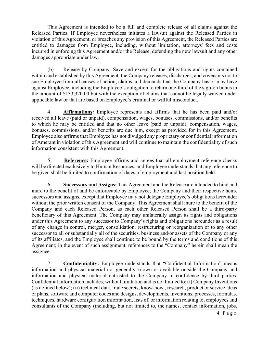 4 | P a g e This Agreement is intended to be a full and complete release of all claims against the Released Parties. If Employee nevertheless initiates a lawsuit against the Released Parties in violation of this Agreement, or breaches any provision of this Agreement, the Released Parties are entitled to damages from Employee, including, without limitation, attorneys' fees and costs incurred in enforcing this Agreement and/or the Release, defending the new lawsuit and any other damages appropriate under law. (b) Release by Company: Save and except for the obligations and rights contained within and established by this Agreement, the Company releases, discharges, and covenants not to sue Employee from all causes of action, claims and demands that the Company has or may have against Employee, including the Employee’s obligation to return one-third of the sign-on bonus in the amount of $133,320.00 but with the exception of claims that cannot be legally waived under applicable law or that are based on Employee’s criminal or willful misconduct. 4. Affirmations: Employee represents and affirms that he has been paid and/or received all leave (paid or unpaid), compensation, wages, bonuses, commissions, and/or benefits to which he may be entitled and that no other leave (paid or unpaid), compensation, wages, bonuses, commissions, and/or benefits are due him, except as provided for in this Agreement. Employee also affirms that Employee has not divulged any proprietary or confidential information of Amerant in violation of this Agreement and will continue to maintain the confidentiality of such information consistent with this Agreement. 5. Reference: Employee affirms and agrees that all employment reference checks will be directed exclusively to Human Resources, and Employee understands that any reference to be given shall be limited to confirmation of dates of employment and last position held. 6. Successors and Assigns: This Agreement and the Release are intended to bind and inure to the benefit of and be enforceable by Employee, the Company and their respective heirs, successors and assigns, except that Employee may not delegate Employee’s obligations hereunder without the prior written consent of the Company. This Agreement shall inure to the benefit of the Company and each Released Person, as each other Released Person shall be a third-party beneficiary of this Agreement. The Company may unilaterally assign its rights and obligations under this Agreement to any successor to Company’s rights and obligations hereunder as a result of any change in control, merger, consolidation, restructuring or reorganization or to any other successor to all or substantially all of the securities, business and/or assets of the Company or any of its affiliates, and the Employee shall continue to be bound by the terms and conditions of this Agreement; in the event of such assignment, references to the “Company” herein shall mean the assignee. 7. Confidentiality: Employee understands that “Confidential Information” means information and physical material not generally known or available outside the Company and information and physical material entrusted to the Company in confidence by third parties. Confidential Information includes, without limitation and is not limited to: (i) Company Inventions (as defined below); (ii) technical data, trade secrets, know-how , research, product or service ideas or plans, software and computer codes and designs, developments, inventions, processes, formulas, techniques, hardware configuration information, lists of, or information relating to, employees and consultants of the Company (including, but not limited to, the names, contact information, jobs,