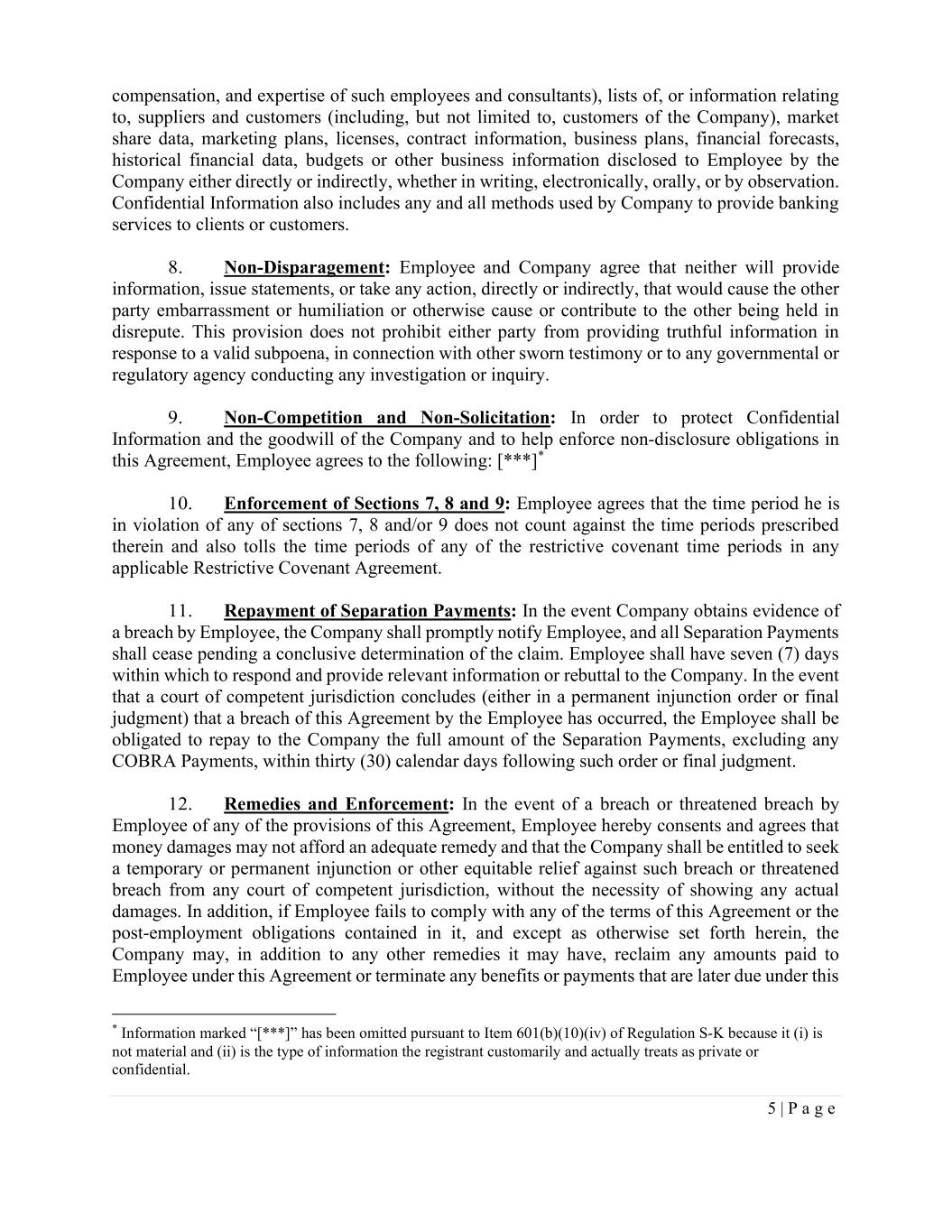 5 | P a g e compensation, and expertise of such employees and consultants), lists of, or information relating to, suppliers and customers (including, but not limited to, customers of the Company), market share data, marketing plans, licenses, contract information, business plans, financial forecasts, historical financial data, budgets or other business information disclosed to Employee by the Company either directly or indirectly, whether in writing, electronically, orally, or by observation. Confidential Information also includes any and all methods used by Company to provide banking services to clients or customers. 8. Non-Disparagement: Employee and Company agree that neither will provide information, issue statements, or take any action, directly or indirectly, that would cause the other party embarrassment or humiliation or otherwise cause or contribute to the other being held in disrepute. This provision does not prohibit either party from providing truthful information in response to a valid subpoena, in connection with other sworn testimony or to any governmental or regulatory agency conducting any investigation or inquiry. 9. Non-Competition and Non-Solicitation: In order to protect Confidential Information and the goodwill of the Company and to help enforce non-disclosure obligations in this Agreement, Employee agrees to the following: [***]* 10. Enforcement of Sections 7, 8 and 9: Employee agrees that the time period he is in violation of any of sections 7, 8 and/or 9 does not count against the time periods prescribed therein and also tolls the time periods of any of the restrictive covenant time periods in any applicable Restrictive Covenant Agreement. 11. Repayment of Separation Payments: In the event Company obtains evidence of a breach by Employee, the Company shall promptly notify Employee, and all Separation Payments shall cease pending a conclusive determination of the claim. Employee shall have seven (7) days within which to respond and provide relevant information or rebuttal to the Company. In the event that a court of competent jurisdiction concludes (either in a permanent injunction order or final judgment) that a breach of this Agreement by the Employee has occurred, the Employee shall be obligated to repay to the Company the full amount of the Separation Payments, excluding any COBRA Payments, within thirty (30) calendar days following such order or final judgment. 12. Remedies and Enforcement: In the event of a breach or threatened breach by Employee of any of the provisions of this Agreement, Employee hereby consents and agrees that money damages may not afford an adequate remedy and that the Company shall be entitled to seek a temporary or permanent injunction or other equitable relief against such breach or threatened breach from any court of competent jurisdiction, without the necessity of showing any actual damages. In addition, if Employee fails to comply with any of the terms of this Agreement or the post-employment obligations contained in it, and except as otherwise set forth herein, the Company may, in addition to any other remedies it may have, reclaim any amounts paid to Employee under this Agreement or terminate any benefits or payments that are later due under this * Information marked “[***]” has been omitted pursuant to Item 601(b)(10)(iv) of Regulation S-K because it (i) is not material and (ii) is the type of information the registrant customarily and actually treats as private or confidential.