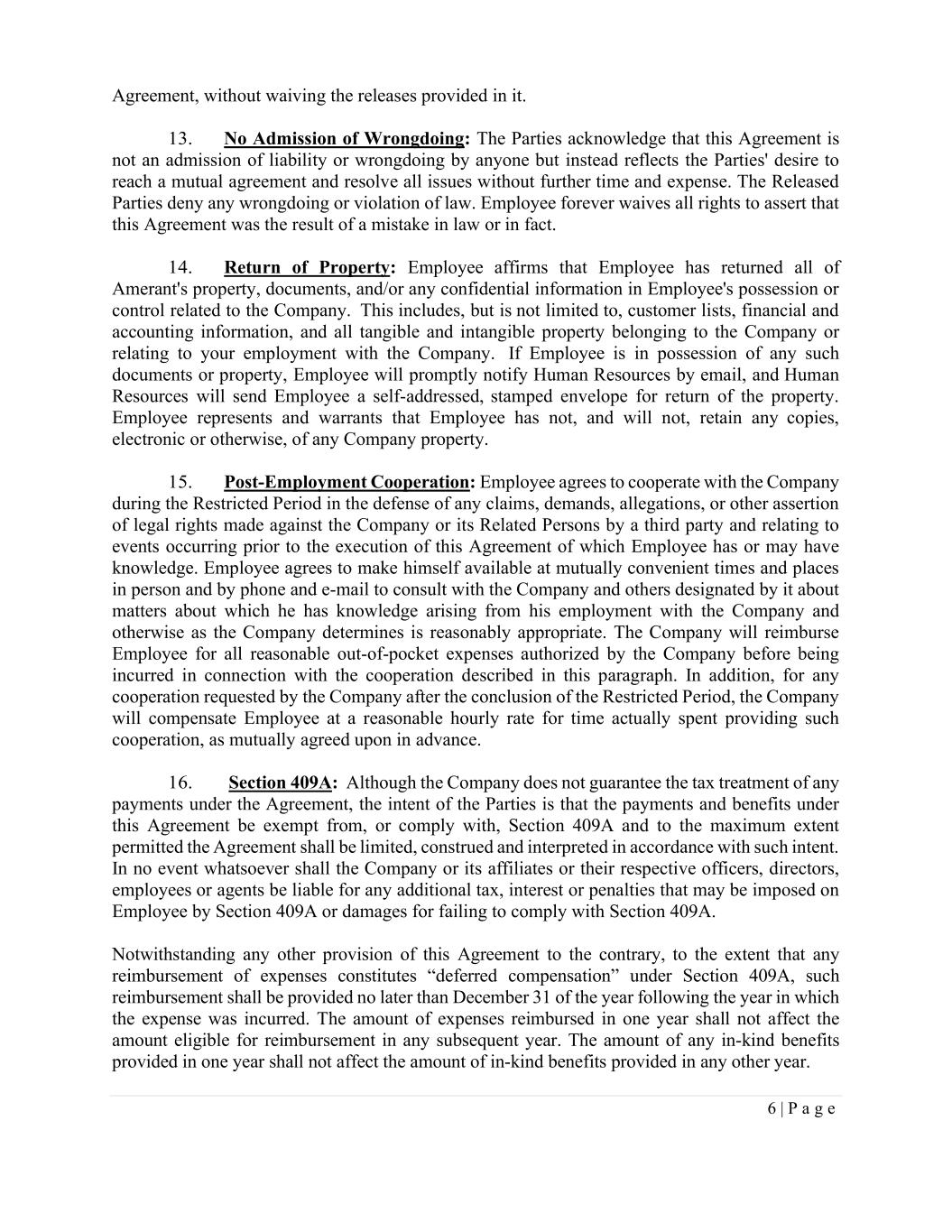 6 | P a g e Agreement, without waiving the releases provided in it. 13. No Admission of Wrongdoing: The Parties acknowledge that this Agreement is not an admission of liability or wrongdoing by anyone but instead reflects the Parties' desire to reach a mutual agreement and resolve all issues without further time and expense. The Released Parties deny any wrongdoing or violation of law. Employee forever waives all rights to assert that this Agreement was the result of a mistake in law or in fact. 14. Return of Property: Employee affirms that Employee has returned all of Amerant's property, documents, and/or any confidential information in Employee's possession or control related to the Company. This includes, but is not limited to, customer lists, financial and accounting information, and all tangible and intangible property belonging to the Company or relating to your employment with the Company. If Employee is in possession of any such documents or property, Employee will promptly notify Human Resources by email, and Human Resources will send Employee a self-addressed, stamped envelope for return of the property. Employee represents and warrants that Employee has not, and will not, retain any copies, electronic or otherwise, of any Company property. 15. Post-Employment Cooperation: Employee agrees to cooperate with the Company during the Restricted Period in the defense of any claims, demands, allegations, or other assertion of legal rights made against the Company or its Related Persons by a third party and relating to events occurring prior to the execution of this Agreement of which Employee has or may have knowledge. Employee agrees to make himself available at mutually convenient times and places in person and by phone and e-mail to consult with the Company and others designated by it about matters about which he has knowledge arising from his employment with the Company and otherwise as the Company determines is reasonably appropriate. The Company will reimburse Employee for all reasonable out-of-pocket expenses authorized by the Company before being incurred in connection with the cooperation described in this paragraph. In addition, for any cooperation requested by the Company after the conclusion of the Restricted Period, the Company will compensate Employee at a reasonable hourly rate for time actually spent providing such cooperation, as mutually agreed upon in advance. 16. Section 409A: Although the Company does not guarantee the tax treatment of any payments under the Agreement, the intent of the Parties is that the payments and benefits under this Agreement be exempt from, or comply with, Section 409A and to the maximum extent permitted the Agreement shall be limited, construed and interpreted in accordance with such intent. In no event whatsoever shall the Company or its affiliates or their respective officers, directors, employees or agents be liable for any additional tax, interest or penalties that may be imposed on Employee by Section 409A or damages for failing to comply with Section 409A. Notwithstanding any other provision of this Agreement to the contrary, to the extent that any reimbursement of expenses constitutes “deferred compensation” under Section 409A, such reimbursement shall be provided no later than December 31 of the year following the year in which the expense was incurred. The amount of expenses reimbursed in one year shall not affect the amount eligible for reimbursement in any subsequent year. The amount of any in-kind benefits provided in one year shall not affect the amount of in-kind benefits provided in any other year.