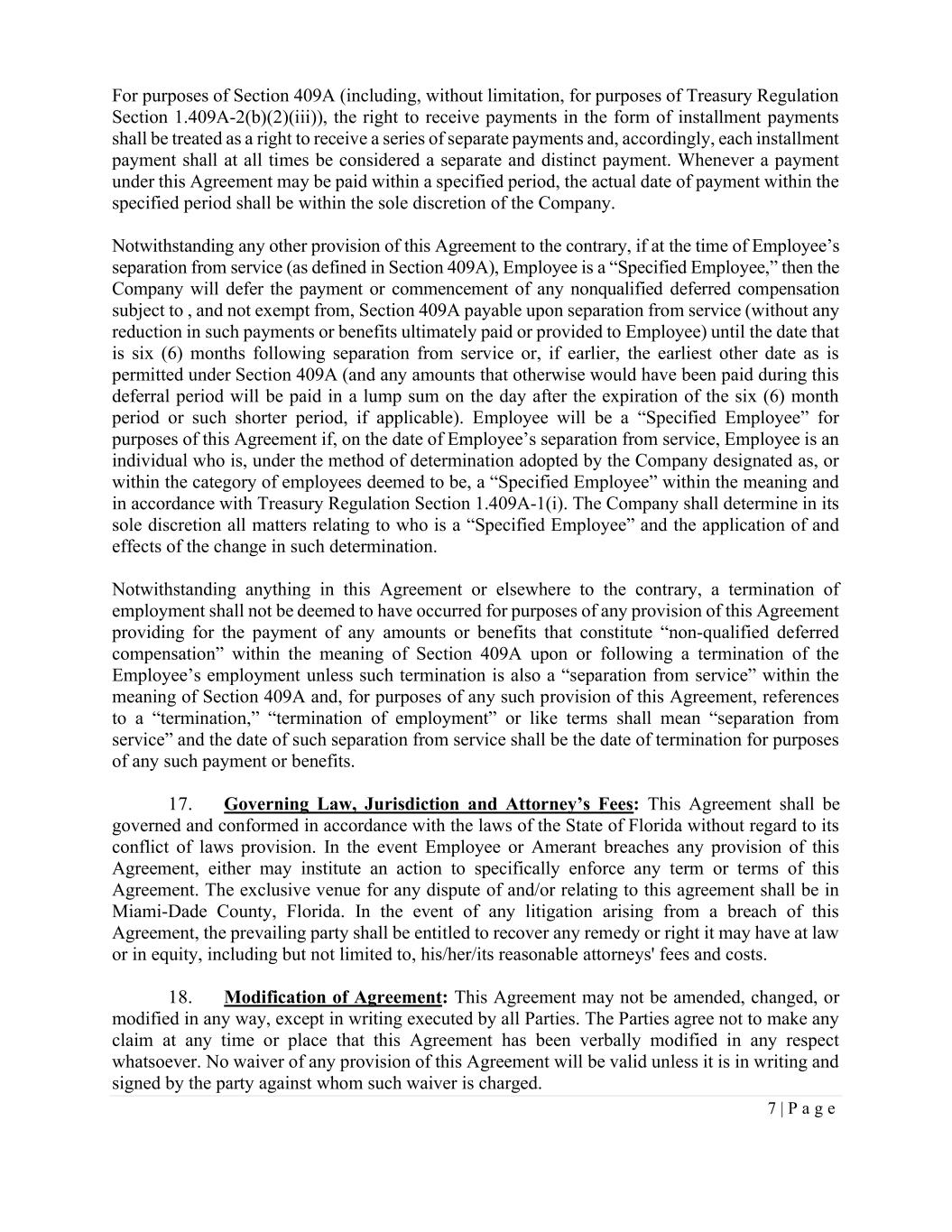 7 | P a g e For purposes of Section 409A (including, without limitation, for purposes of Treasury Regulation Section 1.409A-2(b)(2)(iii)), the right to receive payments in the form of installment payments shall be treated as a right to receive a series of separate payments and, accordingly, each installment payment shall at all times be considered a separate and distinct payment. Whenever a payment under this Agreement may be paid within a specified period, the actual date of payment within the specified period shall be within the sole discretion of the Company. Notwithstanding any other provision of this Agreement to the contrary, if at the time of Employee’s separation from service (as defined in Section 409A), Employee is a “Specified Employee,” then the Company will defer the payment or commencement of any nonqualified deferred compensation subject to , and not exempt from, Section 409A payable upon separation from service (without any reduction in such payments or benefits ultimately paid or provided to Employee) until the date that is six (6) months following separation from service or, if earlier, the earliest other date as is permitted under Section 409A (and any amounts that otherwise would have been paid during this deferral period will be paid in a lump sum on the day after the expiration of the six (6) month period or such shorter period, if applicable). Employee will be a “Specified Employee” for purposes of this Agreement if, on the date of Employee’s separation from service, Employee is an individual who is, under the method of determination adopted by the Company designated as, or within the category of employees deemed to be, a “Specified Employee” within the meaning and in accordance with Treasury Regulation Section 1.409A-1(i). The Company shall determine in its sole discretion all matters relating to who is a “Specified Employee” and the application of and effects of the change in such determination. Notwithstanding anything in this Agreement or elsewhere to the contrary, a termination of employment shall not be deemed to have occurred for purposes of any provision of this Agreement providing for the payment of any amounts or benefits that constitute “non-qualified deferred compensation” within the meaning of Section 409A upon or following a termination of the Employee’s employment unless such termination is also a “separation from service” within the meaning of Section 409A and, for purposes of any such provision of this Agreement, references to a “termination,” “termination of employment” or like terms shall mean “separation from service” and the date of such separation from service shall be the date of termination for purposes of any such payment or benefits. 17. Governing Law, Jurisdiction and Attorney’s Fees: This Agreement shall be governed and conformed in accordance with the laws of the State of Florida without regard to its conflict of laws provision. In the event Employee or Amerant breaches any provision of this Agreement, either may institute an action to specifically enforce any term or terms of this Agreement. The exclusive venue for any dispute of and/or relating to this agreement shall be in Miami-Dade County, Florida. In the event of any litigation arising from a breach of this Agreement, the prevailing party shall be entitled to recover any remedy or right it may have at law or in equity, including but not limited to, his/her/its reasonable attorneys' fees and costs. 18. Modification of Agreement: This Agreement may not be amended, changed, or modified in any way, except in writing executed by all Parties. The Parties agree not to make any claim at any time or place that this Agreement has been verbally modified in any respect whatsoever. No waiver of any provision of this Agreement will be valid unless it is in writing and signed by the party against whom such waiver is charged.
