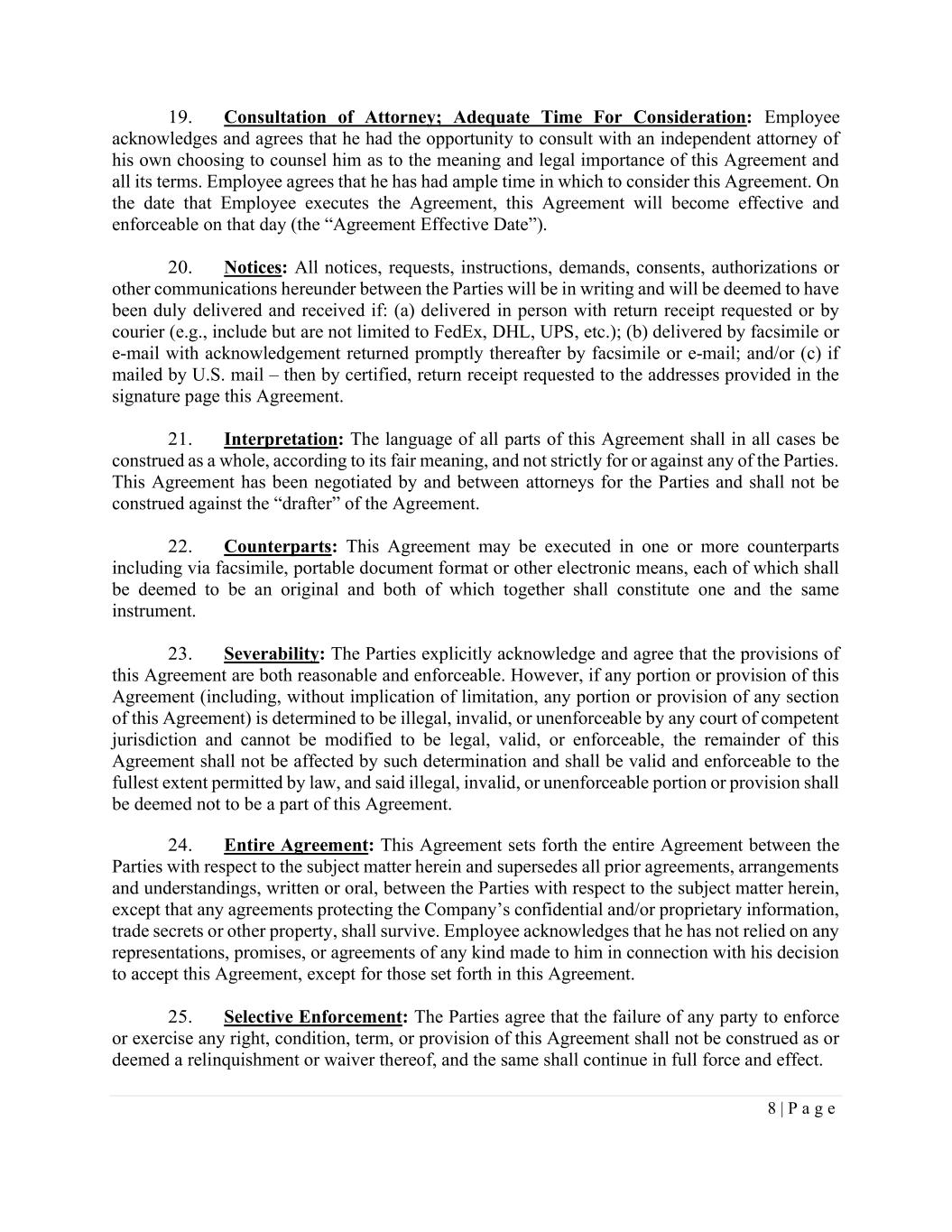 8 | P a g e 19. Consultation of Attorney; Adequate Time For Consideration: Employee acknowledges and agrees that he had the opportunity to consult with an independent attorney of his own choosing to counsel him as to the meaning and legal importance of this Agreement and all its terms. Employee agrees that he has had ample time in which to consider this Agreement. On the date that Employee executes the Agreement, this Agreement will become effective and enforceable on that day (the “Agreement Effective Date”). 20. Notices: All notices, requests, instructions, demands, consents, authorizations or other communications hereunder between the Parties will be in writing and will be deemed to have been duly delivered and received if: (a) delivered in person with return receipt requested or by courier (e.g., include but are not limited to FedEx, DHL, UPS, etc.); (b) delivered by facsimile or e-mail with acknowledgement returned promptly thereafter by facsimile or e-mail; and/or (c) if mailed by U.S. mail – then by certified, return receipt requested to the addresses provided in the signature page this Agreement. 21. Interpretation: The language of all parts of this Agreement shall in all cases be construed as a whole, according to its fair meaning, and not strictly for or against any of the Parties. This Agreement has been negotiated by and between attorneys for the Parties and shall not be construed against the “drafter” of the Agreement. 22. Counterparts: This Agreement may be executed in one or more counterparts including via facsimile, portable document format or other electronic means, each of which shall be deemed to be an original and both of which together shall constitute one and the same instrument. 23. Severability: The Parties explicitly acknowledge and agree that the provisions of this Agreement are both reasonable and enforceable. However, if any portion or provision of this Agreement (including, without implication of limitation, any portion or provision of any section of this Agreement) is determined to be illegal, invalid, or unenforceable by any court of competent jurisdiction and cannot be modified to be legal, valid, or enforceable, the remainder of this Agreement shall not be affected by such determination and shall be valid and enforceable to the fullest extent permitted by law, and said illegal, invalid, or unenforceable portion or provision shall be deemed not to be a part of this Agreement. 24. Entire Agreement: This Agreement sets forth the entire Agreement between the Parties with respect to the subject matter herein and supersedes all prior agreements, arrangements and understandings, written or oral, between the Parties with respect to the subject matter herein, except that any agreements protecting the Company’s confidential and/or proprietary information, trade secrets or other property, shall survive. Employee acknowledges that he has not relied on any representations, promises, or agreements of any kind made to him in connection with his decision to accept this Agreement, except for those set forth in this Agreement. 25. Selective Enforcement: The Parties agree that the failure of any party to enforce or exercise any right, condition, term, or provision of this Agreement shall not be construed as or deemed a relinquishment or waiver thereof, and the same shall continue in full force and effect.
