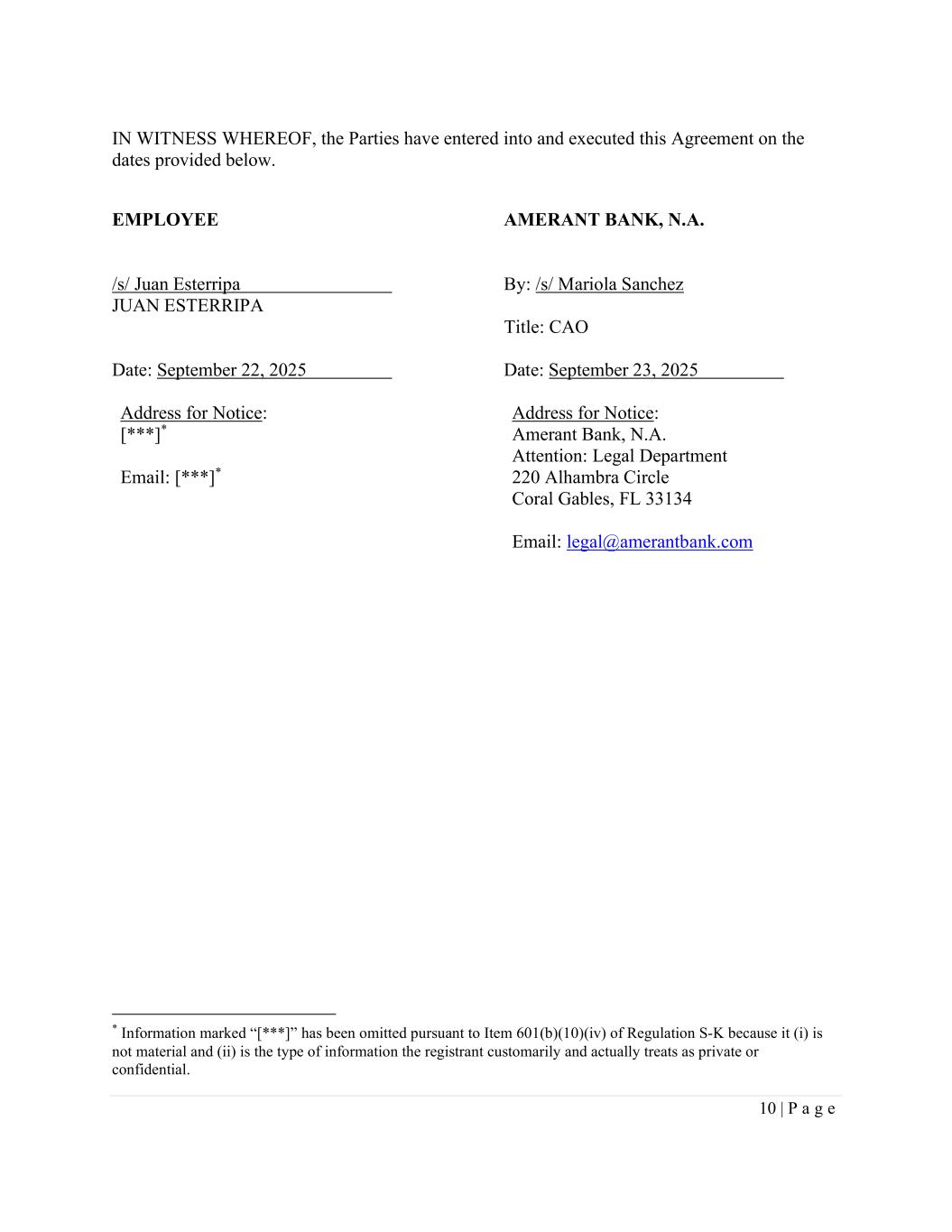 10 | P a g e IN WITNESS WHEREOF, the Parties have entered into and executed this Agreement on the dates provided below. EMPLOYEE AMERANT BANK, N.A. /s/ Juan Esterripa By: /s/ Mariola Sanchez JUAN ESTERRIPA Title: CAO Date: September 22, 2025 Date: September 23, 2025 Address for Notice: Address for Notice: [***]* Email: [***]* Amerant Bank, N.A. Attention: Legal Department 220 Alhambra Circle Coral Gables, FL 33134 Email: legal@amerantbank.com * Information marked “[***]” has been omitted pursuant to Item 601(b)(10)(iv) of Regulation S-K because it (i) is not material and (ii) is the type of information the registrant customarily and actually treats as private or confidential.