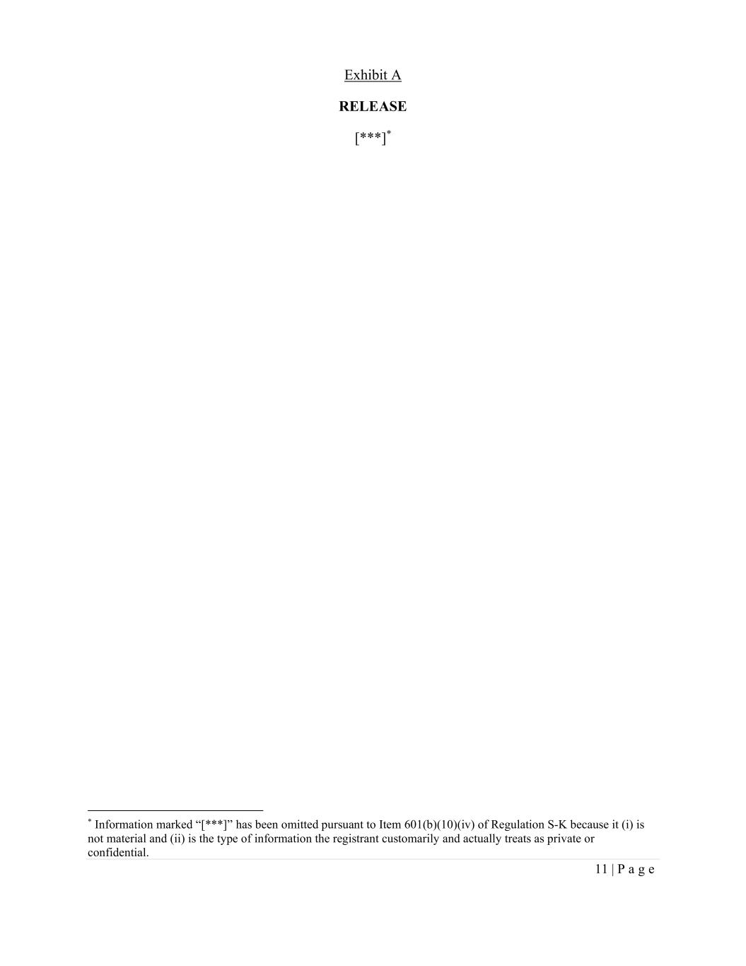 11 | P a g e Exhibit A RELEASE [***]* * Information marked “[***]” has been omitted pursuant to Item 601(b)(10)(iv) of Regulation S-K because it (i) is not material and (ii) is the type of information the registrant customarily and actually treats as private or confidential.
