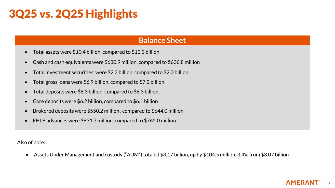 2 Important Notices and Disclaimers Forward-Looking Statements This presentation contains “forward-looking statements” including statements with respect to the Company’s objectives, expectations and intentions and other statements that are not historical facts. Examples of forward- looking statements include but are not limited to: our future operating or financial performance, including revenues, expenses, expense savings, income or loss and earnings or loss per share, and other financial items; statements regarding expectations, plans or objectives for future operations, products or services, and our expectations on our investment portfolio repositioning and loan recoveries or reaching positive resolutions on problem loans. All statements other than statements of historical fact are statements that could be forward-looking statements. You can identify these forward-looking statements through our use of words such as “may,” “will,” “anticipate,” “assume,” “should,” “indicate,” “would,” “believe,” “contemplate,” “expect,” “estimate,” “continue,” “plan,” “point to,” “project,” “could,” “intend,” “target,” “goals,” “outlook,” “modeled,” “dedicated,” “create,” and other similar words and expressions of the future. Forward-looking statements, including those relating to our beliefs, plans, objectives, goals, expectations, anticipations, estimates and intentions, involve known and unknown risks, uncertainties and other factors, which may be beyond our control, and which may cause the Company’s actual results, performance, achievements, or financial condition to be materially different from future results, performance, achievements, or financial condition expressed or implied by such forward-looking statements. You should not rely on any forward-looking statements as predictions of future events. You should not expect us to update any forward-looking statements, except as required by law. All written or oral forward-looking statements attributable to us are expressly qualified in their entirety by this cautionary notice, together with those risks and uncertainties described in “Risk factors” in our annual report on Form 10-K for the fiscal year ended December 31, 2024 filed on March 5, 2025, and in our other filings with the U.S. Securities and Exchange Commission (the “SEC”), which are available at the SEC’s website www.sec.gov. Interim Financial Information Unaudited financial information as of and for interim periods, including the three and nine month periods ended September 30, 2025 and 2024, and the three months ended June 30, 2025, March 31, 2025, and December 31, 2024 may not reflect our results of operations for our fiscal year ending, or financial condition as of December 31, 2025, or any other period of time or date. Non-GAAP Financial Measures The Company supplements its financial results that are determined in accordance with accounting principles generally accepted in the United States of America (“GAAP”) with non-GAAP financial measures, such as “pre- provision net revenue (PPNR)”, “core pre-provision net revenue (Core PPNR)”, “core noninterest income”, “core noninterest expense”, “core net income”, “core earnings per share (basic and diluted)”, “core return on assets (Core ROA)”, “core return on equity (Core ROE)”, “core efficiency ratio”, and “tangible stockholders’ equity (book value) per common share" . This supplemental information is not required by, or is not presented in accordance with GAAP. The Company refers to these financial measures and ratios as “non-GAAP financial measures”. We use certain non-GAAP financial measures, including those mentioned above, both to explain our results to shareholders and the investment community and in the internal evaluation and management of our business. Management believes that these supplementary non-GAAP financial measures and the information they provide are useful to investors since these measures permit investors to view our performance using the same tools that our management uses to evaluate our past performance and prospects for future performance. While we believe that these non-GAAP financial measures are useful in evaluating our performance, this information should be considered as supplemental and not as a substitute for or superior to the related financial information prepared in accordance with GAAP. Additionally, these non-GAAP financial measures may differ from similar measures presented by other companies. Appendix 1 reconciles these non-GAAP financial measures to reported results.