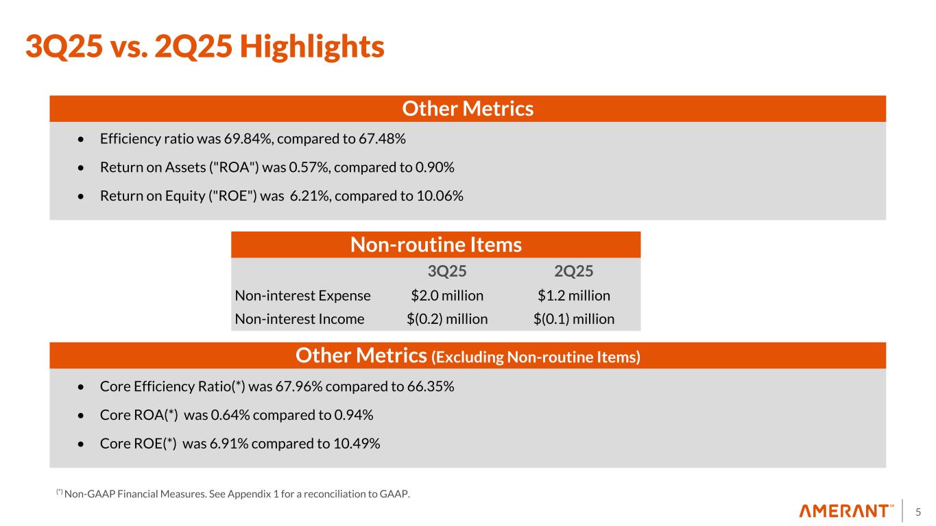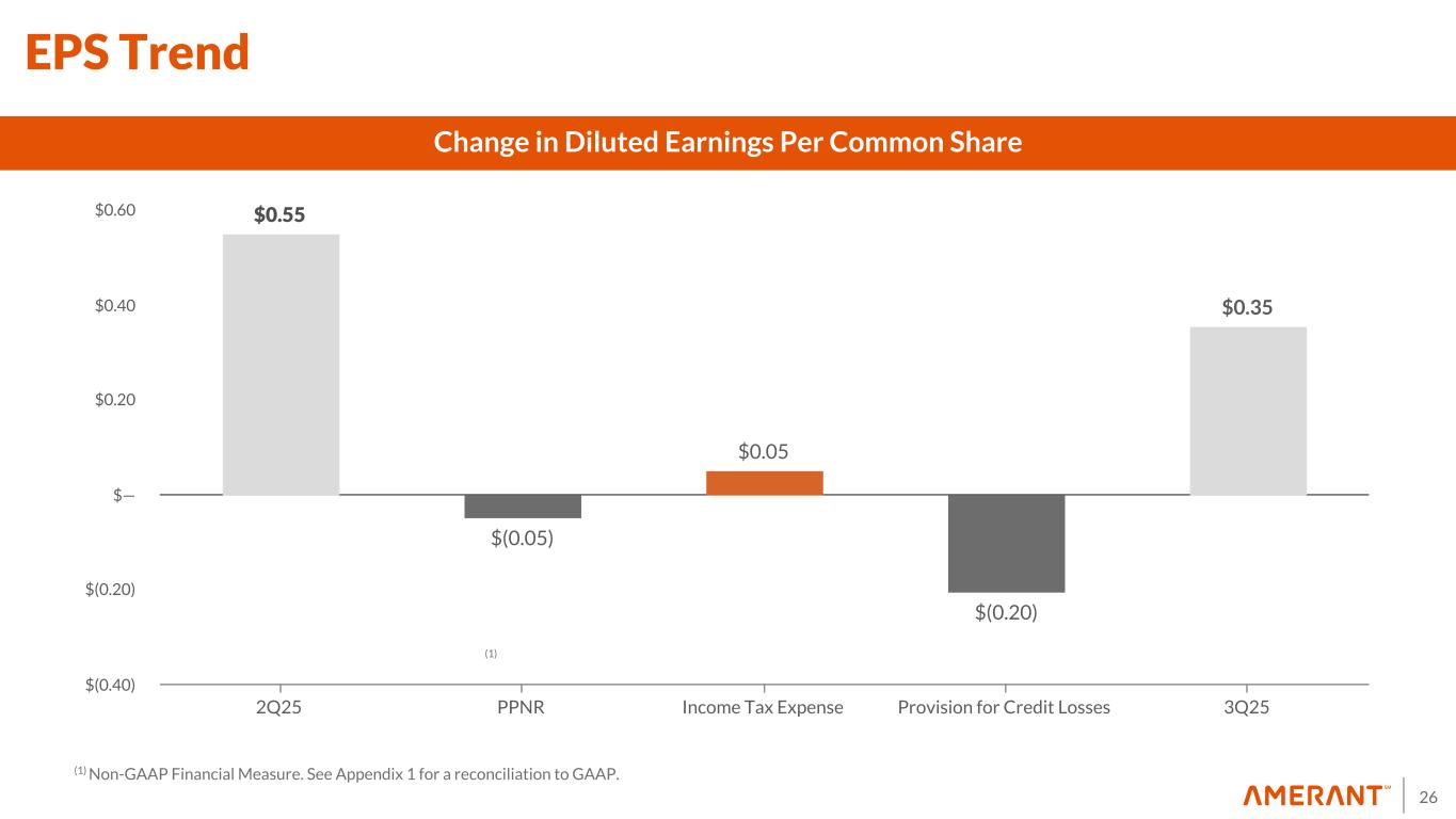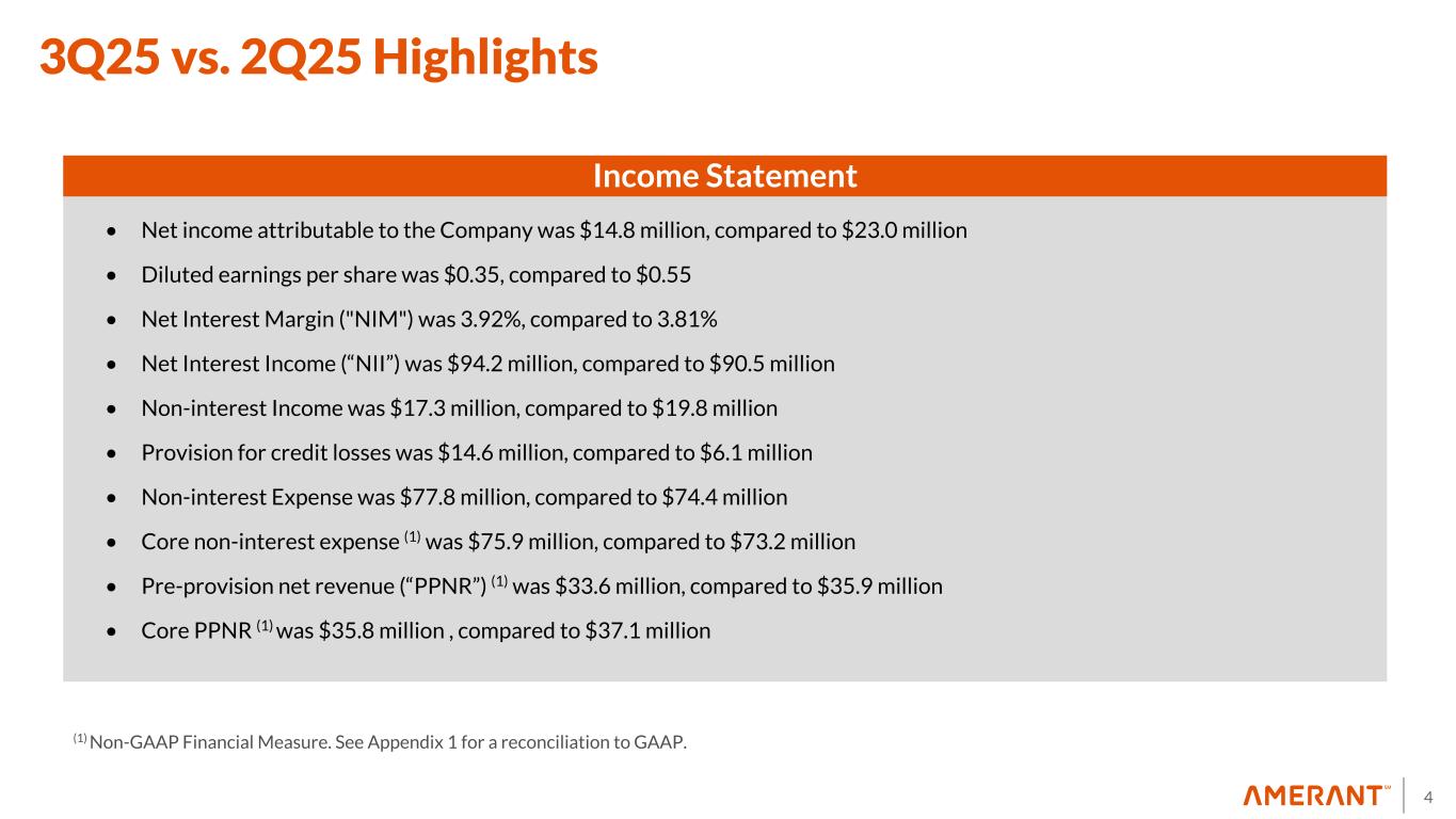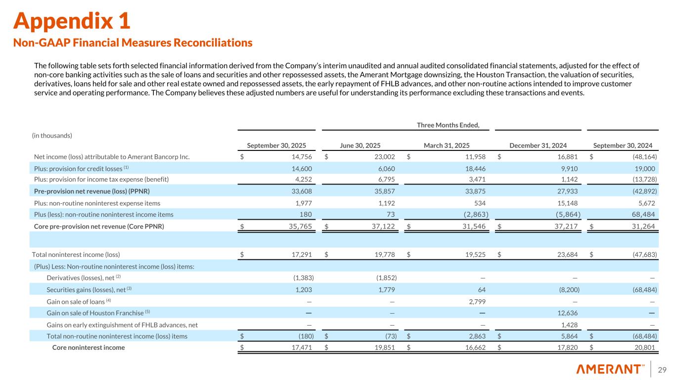 29 Appendix 1 Non-GAAP Financial Measures Reconciliations The following table sets forth selected financial information derived from the Company’s interim unaudited and annual audited consolidated financial statements, adjusted for the effect of non-core banking activities such as the sale of loans and securities and other repossessed assets, the Amerant Mortgage downsizing, the Houston Transaction, the valuation of securities, derivatives, loans held for sale and other real estate owned and repossessed assets, the early repayment of FHLB advances, and other non-routine actions intended to improve customer service and operating performance. The Company believes these adjusted numbers are useful for understanding its performance excluding these transactions and events. Three Months Ended, (in thousands) September 30, 2025 June 30, 2025 March 31, 2025 December 31, 2024 September 30, 2024 Net income (loss) attributable to Amerant Bancorp Inc. $ 14,756 $ 23,002 $ 11,958 $ 16,881 $ (48,164) Plus: provision for credit losses (1) 14,600 6,060 18,446 9,910 19,000 Plus: provision for income tax expense (benefit) 4,252 6,795 3,471 1,142 (13,728) Pre-provision net revenue (loss) (PPNR) 33,608 35,857 33,875 27,933 (42,892) Plus: non-routine noninterest expense items 1,977 1,192 534 15,148 5,672 Plus (less): non-routine noninterest income items 180 73 (2,863) (5,864) 68,484 Core pre-provision net revenue (Core PPNR) $ 35,765 $ 37,122 $ 31,546 $ 37,217 $ 31,264 Total noninterest income (loss) $ 17,291 $ 19,778 $ 19,525 $ 23,684 $ (47,683) (Plus) Less: Non-routine noninterest income (loss) items: Derivatives (losses), net (2) (1,383) (1,852) — — — Securities gains (losses), net (3) 1,203 1,779 64 (8,200) (68,484) Gain on sale of loans (4) — — 2,799 — — Gain on sale of Houston Franchise (5) — — — 12,636 — Gains on early extinguishment of FHLB advances, net — — — 1,428 — Total non-routine noninterest income (loss) items $ (180) $ (73) $ 2,863 $ 5,864 $ (68,484) Core noninterest income $ 17,471 $ 19,851 $ 16,662 $ 17,820 $ 20,801