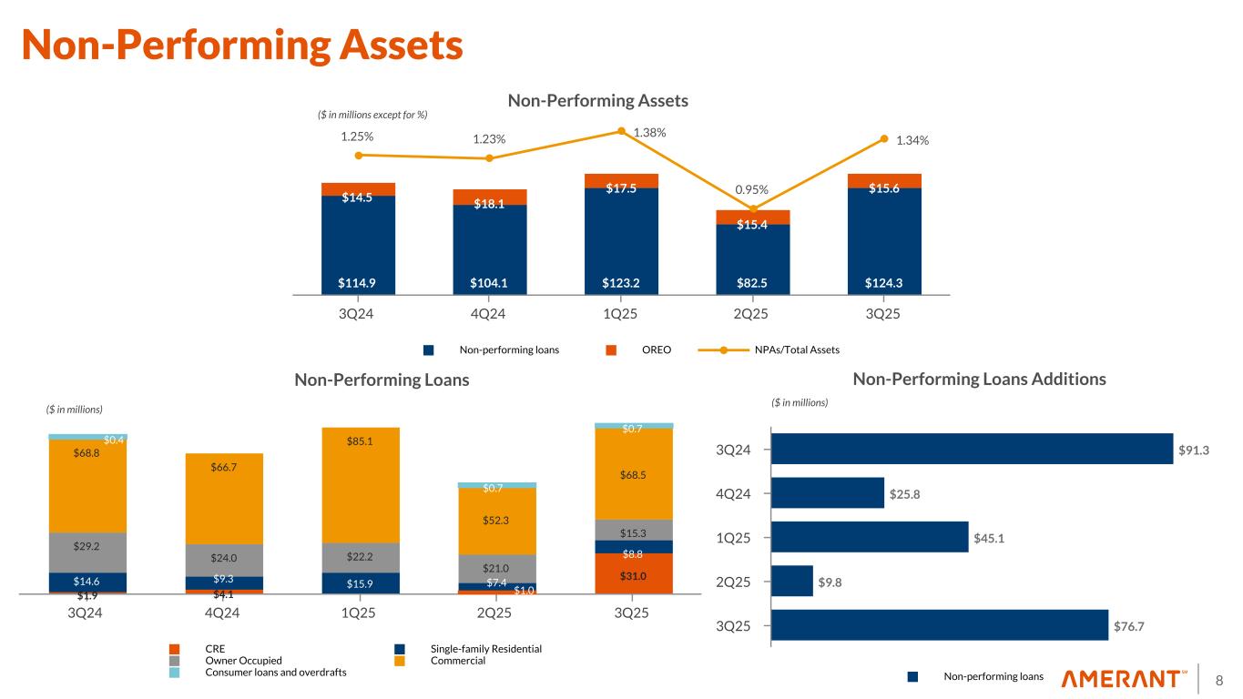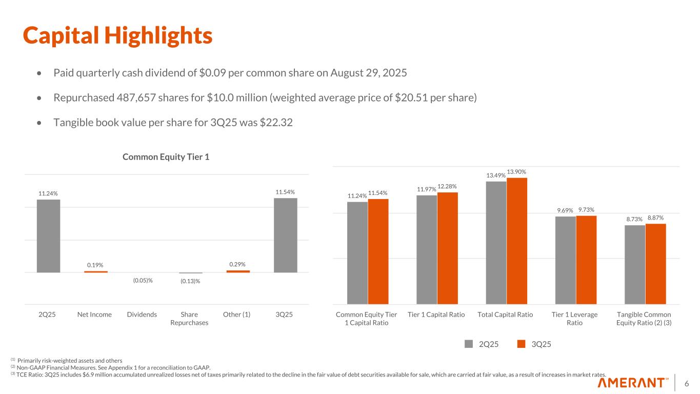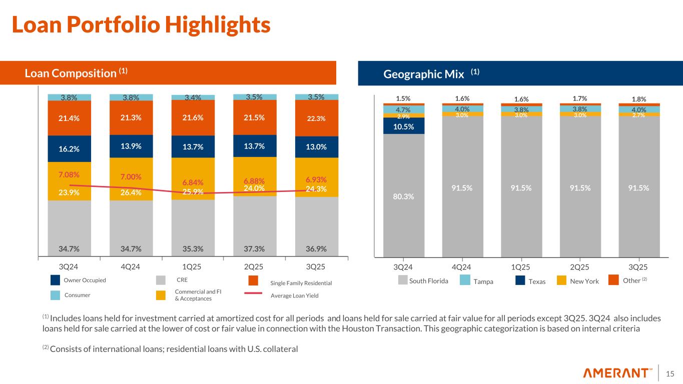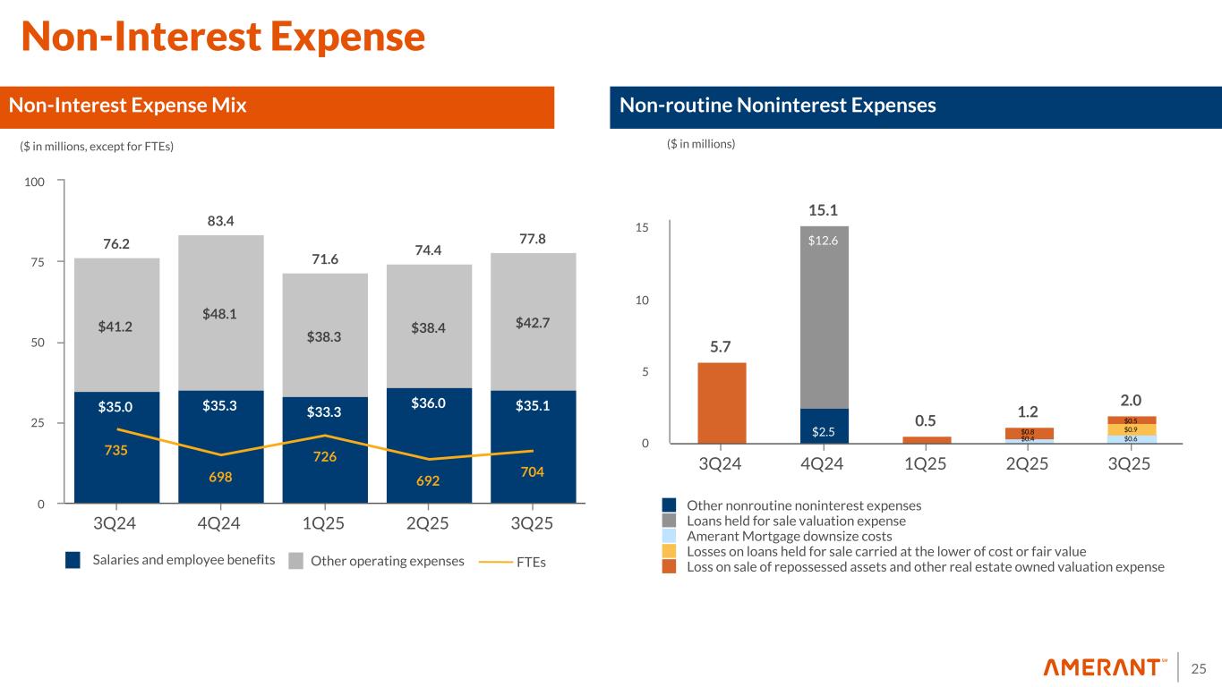 25 76.2 83.4 71.6 74.4 77.8 $35.0 $35.3 $33.3 $36.0 $35.1 $41.2 $48.1 $38.3 $38.4 $42.7 735 698 726 692 704 3Q24 4Q24 1Q25 2Q25 3Q25 0 25 50 75 100 Non-Interest Expense Mix ($ in millions, except for FTEs) Non-routine Noninterest Expenses 5.7 15.1 0.5 1.2 2.0 $2.5 $12.6 Other nonroutine noninterest expenses Loans held for sale valuation expense Amerant Mortgage downsize costs Losses on loans held for sale carried at the lower of cost or fair value Loss on sale of repossessed assets and other real estate owned valuation expense 3Q24 4Q24 1Q25 2Q25 3Q25 0 5 10 15 ($ in millions) Non-Interest Expense Salaries and employee benefits Other operating expenses FTEs $0.4 $0.8 $0.5 $0.9 $0.6