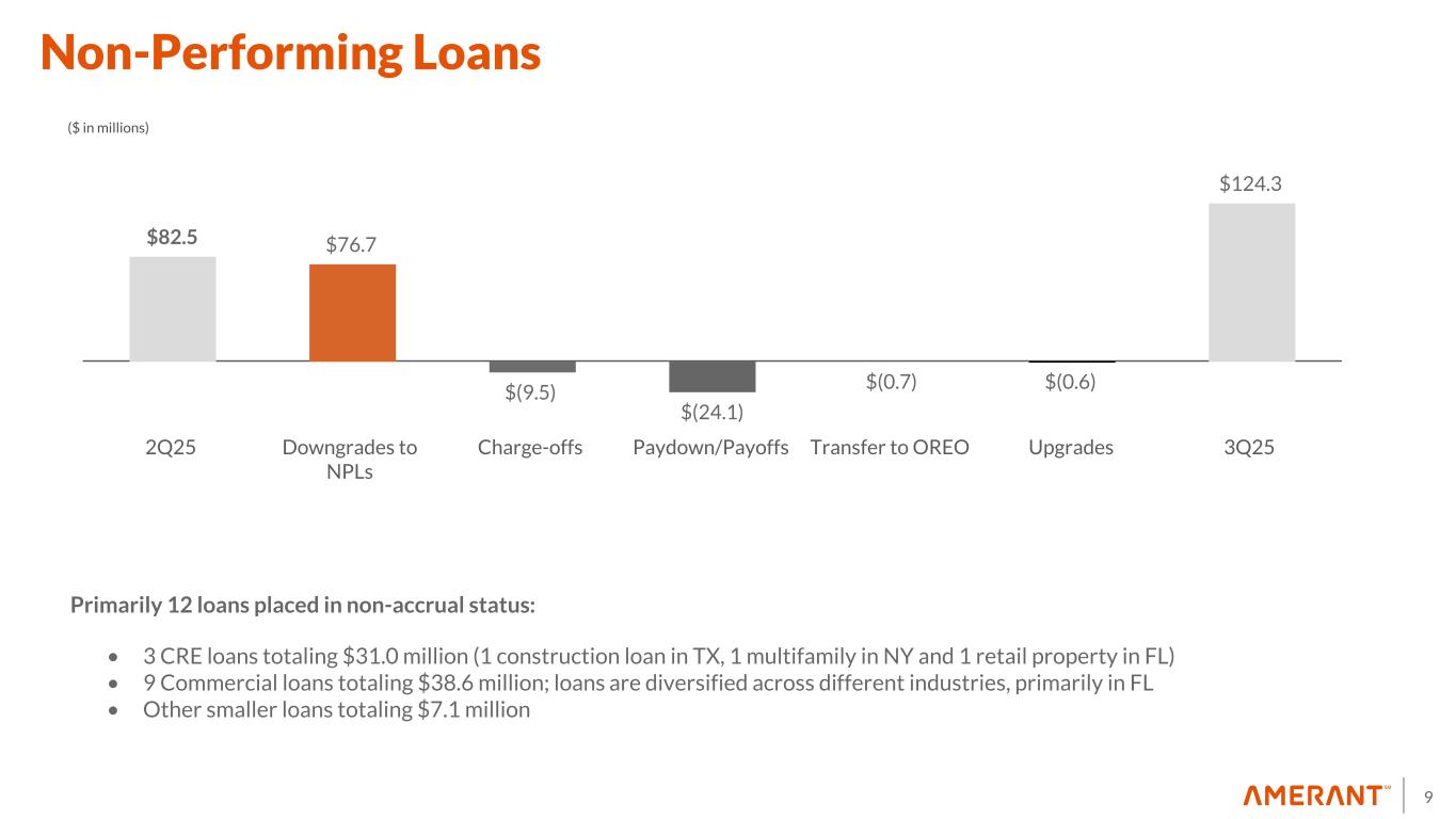 8 Non-Performing Assets $114.9 $104.1 $123.2 $82.5 $124.3 $14.5 $18.1 $17.5 $15.4 $15.6 1.25% 1.23% 1.38% 0.95% 1.34% Non-performing loans OREO NPAs/Total Assets 3Q24 4Q24 1Q25 2Q25 3Q25 Non-Performing Assets Non-Performing Loans Additions ($ in millions except for %) Non-Performing Loans $91.3 $25.8 $45.1 $9.8 $76.7 Non-performing loans 3Q24 4Q24 1Q25 2Q25 3Q25 $1.9 $4.1 $31.0$14.6 $9.3 $15.9 $7.4 $8.8 $29.2 $24.0 $22.2 $21.0 $15.3 $68.8 $66.7 $85.1 $52.3 $68.5 CRE Single-family Residential Owner Occupied Commercial Consumer loans and overdrafts 3Q24 4Q24 1Q25 2Q25 3Q25 ($ in millions) ($ in millions) $1.0 $0.7 $0.7 $0.4