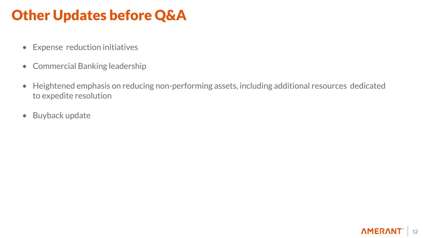 12 Other Updates before Q&A • Expense reduction initiatives • Commercial Banking leadership • Heightened emphasis on reducing non-performing assets, including additional resources dedicated to expedite resolution • Buyback update