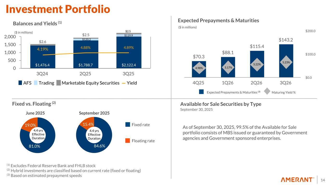 14 84.6% 15.4% $1,476.4 $1,788.7 $2,122.4 $2.6 $2.5 4.19% 4.88% 4.89% AFS Trading Marketable Equity Securities Yield 3Q24 2Q25 3Q25 0 500 1,000 1,500 2,000 81.0% 19.0% Balances and Yields (1) Fixed vs. Floating (2) September 2025 Floating rate Fixed rate Available for Sale Securities by Type September 30, 2025 4.4 yrs Effective Duration ($ in millions) (1) Excludes Federal Reserve Bank and FHLB stock (2) Hybrid investments are classified based on current rate (fixed or floating) (3) Based on estimated prepayment speeds 4.4 yrs Effective Duration $70.3 $88.1 $115.4 $143.2 4Q25 1Q26 2Q26 3Q26 $0.0 $100.0 $200.0 ($ in millions) Expected Prepayments & Maturities Expected Prepayments & Maturities (3) Maturing Yield % Investment Portfolio 4.98% 5.17% 5.22% 5.23% June 2025 As of September 30, 2025, 99.5% of the Available for Sale portfolio consists of MBS issued or guaranteed by Government agencies and Government sponsored enterprises. $120.2 $119.9 $2.5