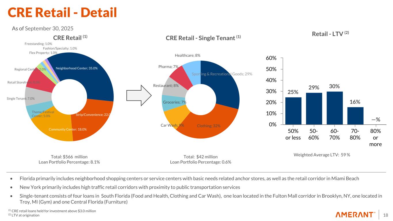 17 CRE Type FL TX NY Other Total % Total CRE % Total Loans (1) Income Producing (2) Land and Construction Retail $ 512 $ 13 $ 81 $ 26 $ 632 24.6 % 9.1 % $ 620 $ 12 Multifamily 336 47 76 22 481 18.8 % 6.9 % 363 121 Office 321 37 40 90 488 19.0 % 7.0 % 485 3 Hotels 252 47 — — 299 11.7 % 4.3 % 287 12 Industrial 74 4 — — 78 3.2 % 1.1 % 78 — Specialty 161 — — 52 213 8.2 % 3.0 % 185 26 Land 326 4 — 42 372 14.5 % 5.4 % — 371 Total CRE $ 1,982 $ 152 $ 197 $ 232 $ 2,563 100.0 % 36.8 % $ 2,018 $ 545 Outstanding as of September 30, 2025 ($ in millions) This geographic segmentation is based on collateral location (1) Calculated as a percentage of loans held for investment only. (2) Income producing properties include non-owner occupied and multi-family residential loans. CRE Loans Held For Investment - Detail
