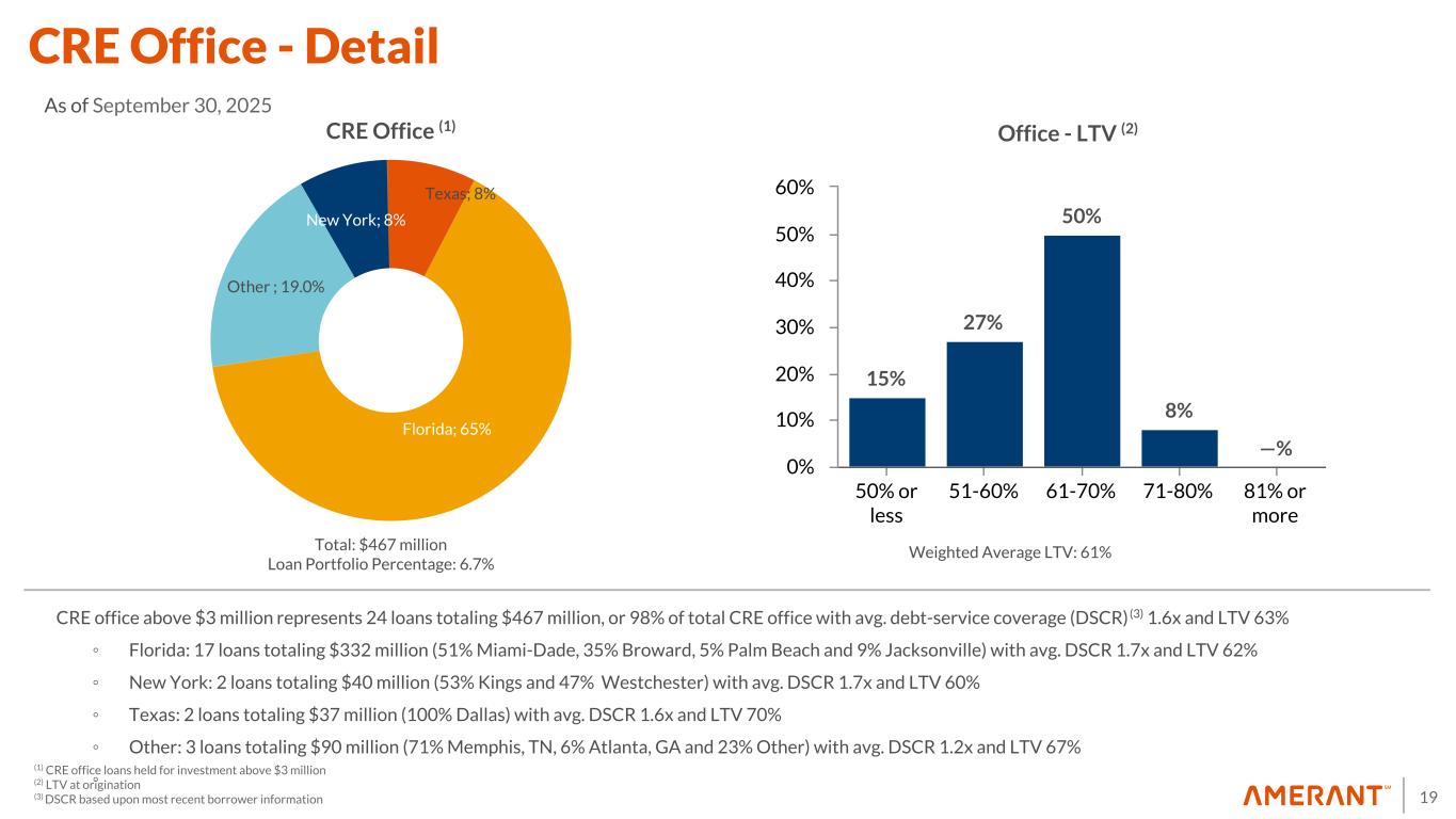 19 New York; 8% Texas; 8% Florida; 65% Other ; 19.0% 15% 27% 50% 8% —% 50% or less 51-60% 61-70% 71-80% 81% or more 0% 10% 20% 30% 40% 50% 60% CRE office above $3 million represents 24 loans totaling $467 million, or 98% of total CRE office with avg. debt-service coverage (DSCR) (3) 1.6x and LTV 63% ◦ Florida: 17 loans totaling $332 million (51% Miami-Dade, 35% Broward, 5% Palm Beach and 9% Jacksonville) with avg. DSCR 1.7x and LTV 62% ◦ New York: 2 loans totaling $40 million (53% Kings and 47% Westchester) with avg. DSCR 1.7x and LTV 60% ◦ Texas: 2 loans totaling $37 million (100% Dallas) with avg. DSCR 1.6x and LTV 70% ◦ Other: 3 loans totaling $90 million (71% Memphis, TN, 6% Atlanta, GA and 23% Other) with avg. DSCR 1.2x and LTV 67% ◦ CRE Office (1) Office - LTV (2) (1) CRE office loans held for investment above $3 million (2) LTV at origination (3) DSCR based upon most recent borrower information Total: $467 million Loan Portfolio Percentage: 6.7% CRE Office - Detail As of September 30, 2025 Weighted Average LTV: 61%
