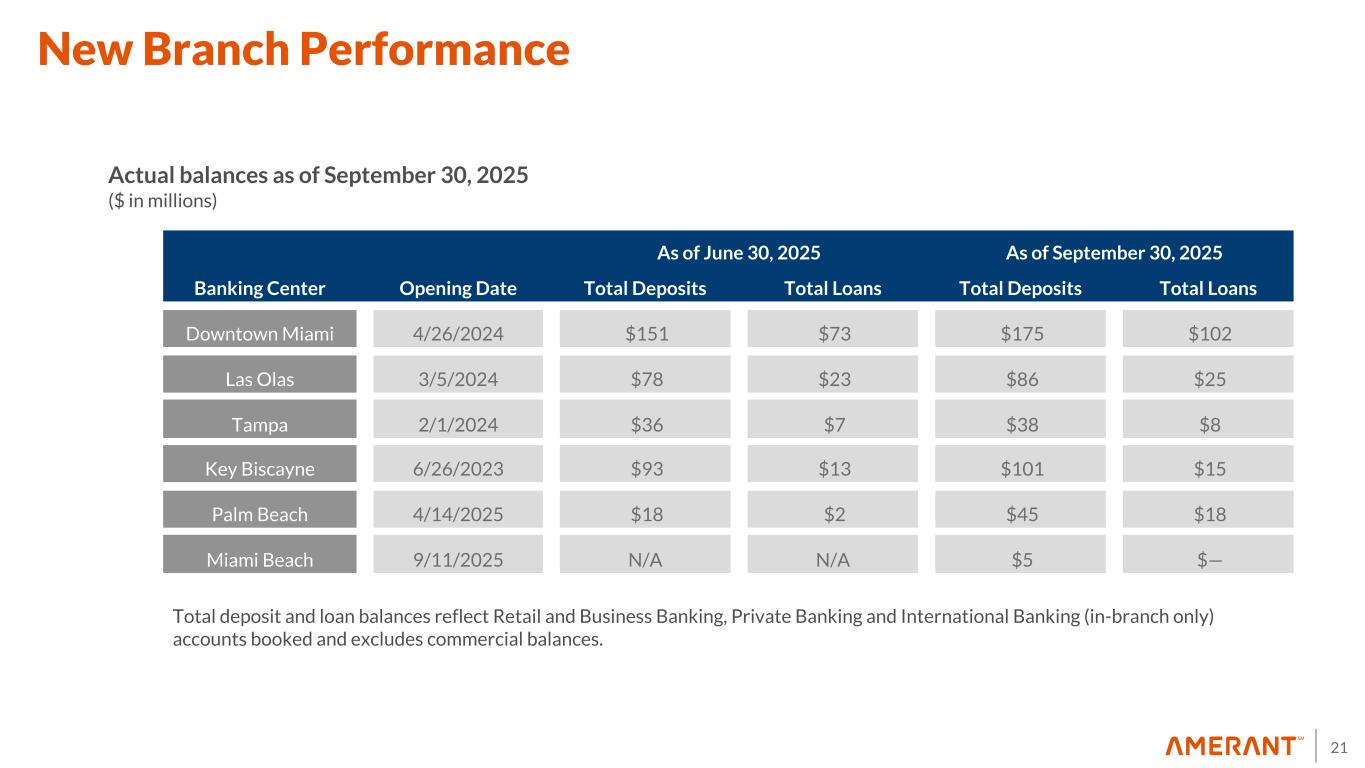 20 8,111 7,855 8,155 8,307 8,301 $4,225 $4,115 $4,280 $4,429 $4,434 $1,702 $1,533 $1,527 $1,528 $1,548 $702 $702 $695 $644 $550 $1,482 $1,505 $1,653 $1,706 $1,769 2.99% 2.76% 2.60% 2.53% 2.41% 3Q24 4Q24 1Q25 2Q25 3Q25 0 1,000 2,000 3,000 4,000 5,000 6,000 7,000 8,000 9,000 $2,423 $2,465 $2,576 $2,568 2022 2023 2024 3Q25 1,000 2,000 3,000 $4,621 $5,430 $5,278 $5,733 2022 2023 2024 3Q25 2,500 5,000 Domestic Deposits ($ in millions) Deposit Composition International Deposits ($ in millions) Mix by Country of Domicile Transaction Deposits Customer CDs Brokered Deposits (1) Cost of total Deposits ($ in millions) Noninterest Bearing Demand Deposits 31% of Total Deposits Approx. avg. acct balance: $45,000 (2) 69% of Total Deposits Approx. avg. acct balance: $110,000 (2) Well Diversified and Stable Deposit Mix (2) Average deposit account balances in Deposit Mix Slide calculated as of December 31, 2024 (1) Brokered Deposits : there were $9 million and $60 million in brokered transaction deposits in 2Q25 and 1Q25, respectively, while there were none in 3Q25, 4Q24 and 3Q24. In 3Q25, 2Q25, 1Q25, 4Q24, and 3Q24 brokered time deposits were $550 million, $635 million, $635 million, $702 million, and $702 million, respectively.