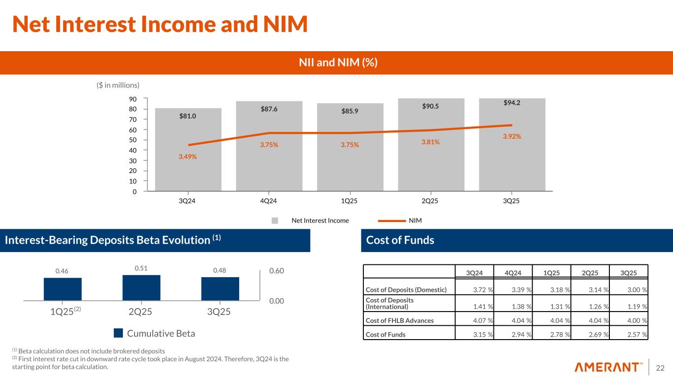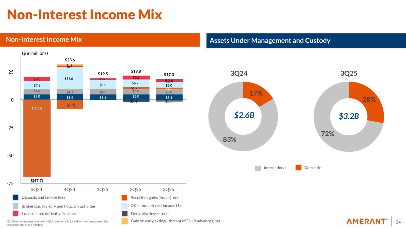 24 $23.6 $19.5 $19.8 $17.3 $(47.7) $5.0 $5.4 $5.1 $5.0 $5.1 $4.5 $4.7 $4.7 $5.0 $5.0 $1.2 $5.0 $2.4 3Q24 4Q24 1Q25 2Q25 3Q25 -75 -50 -25 0 25 17% 83% 28% 72% Non-Interest Income Mix Deposits and service fees Brokerage, advisory and fiduciary activities Other noninterest income (1) DomesticInternational 3Q24 $3.2B ($ in millions) Securities gains (losses), net Loan-related derivative income Derivative losses, net Gain on early extinguishment of FHLB advances, net Non-Interest Income Mix $2.6B Assets Under Management and Custody 3Q25 $(0.2) (1) Other noninterest income in 4Q24 includes a $12.6 million one-time gain on the sale of the Houston Franchise $(68.5) ($1.9) $1.7 $6.7 $3.2 $8.1 $1.5 $0.7 $19.6 $(68.5) $7.8 $3.5 ($1.4) ($8.2) $1.4