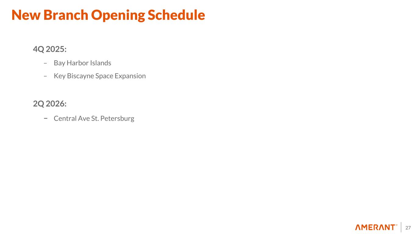 27 New Branch Opening Schedule 4Q 2025: – Bay Harbor Islands – Key Biscayne Space Expansion 2Q 2026: – Central Ave St. Petersburg