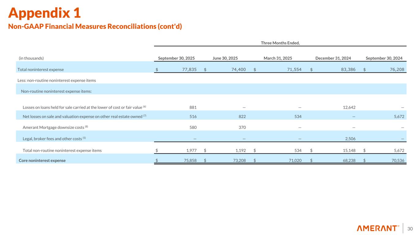 30 Three Months Ended, (in thousands) September 30, 2025 June 30, 2025 March 31, 2025 December 31, 2024 September 30, 2024 Total noninterest expense $ 77,835 $ 74,400 $ 71,554 $ 83,386 $ 76,208 Less: non-routine noninterest expense items Non-routine noninterest expense items: Losses on loans held for sale carried at the lower of cost or fair value (6) 881 — — 12,642 — Net losses on sale and valuation expense on other real estate owned (7) 516 822 534 — 5,672 Amerant Mortgage downsize costs (8) 580 370 — — — Legal, broker fees and other costs (5) — — — 2,506 — Total non-routine noninterest expense items $ 1,977 $ 1,192 $ 534 $ 15,148 $ 5,672 Core noninterest expense $ 75,858 $ 73,208 $ 71,020 $ 68,238 $ 70,536 Appendix 1 Non-GAAP Financial Measures Reconciliations (cont'd)